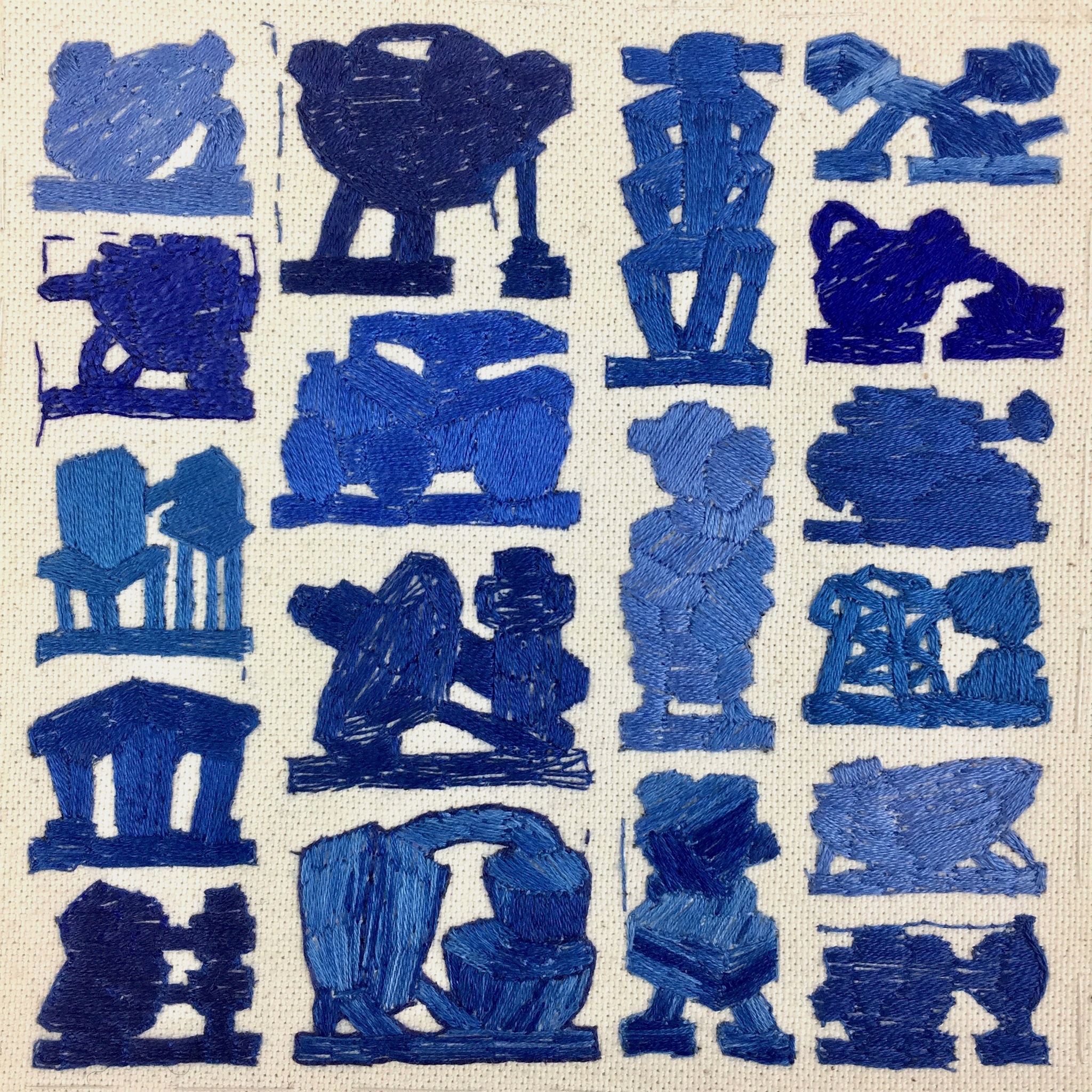 There have been four main series of shaped narratives developed over the last four years – Blue and White Shaped Narratives, Coloured Shaped Narratives, Three-Legged Narratives and Small Object Narratives. The works explore and integrate notions around the sense of shapes within shapes, objects within objects and the relationships and hierarchies between the constituent parts.