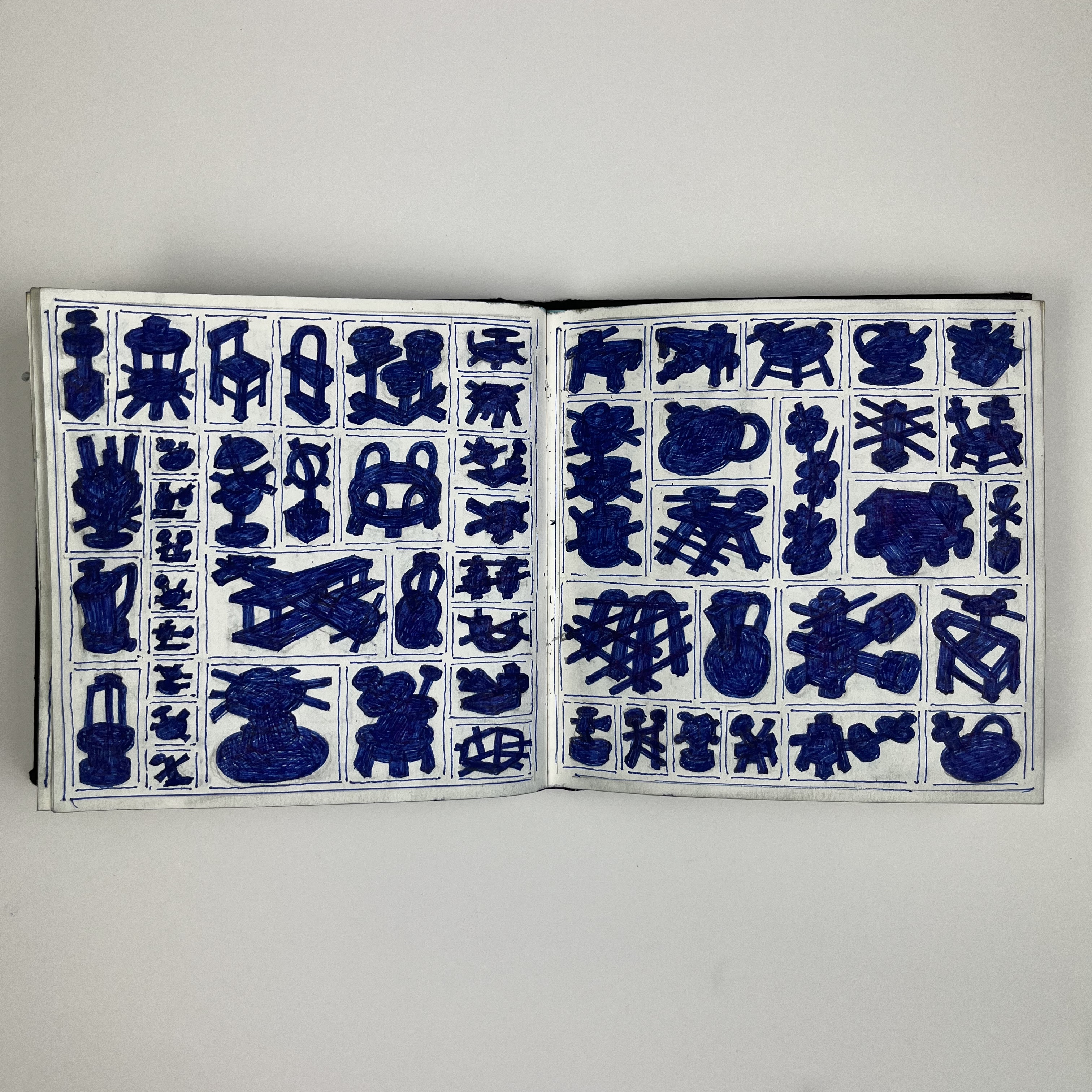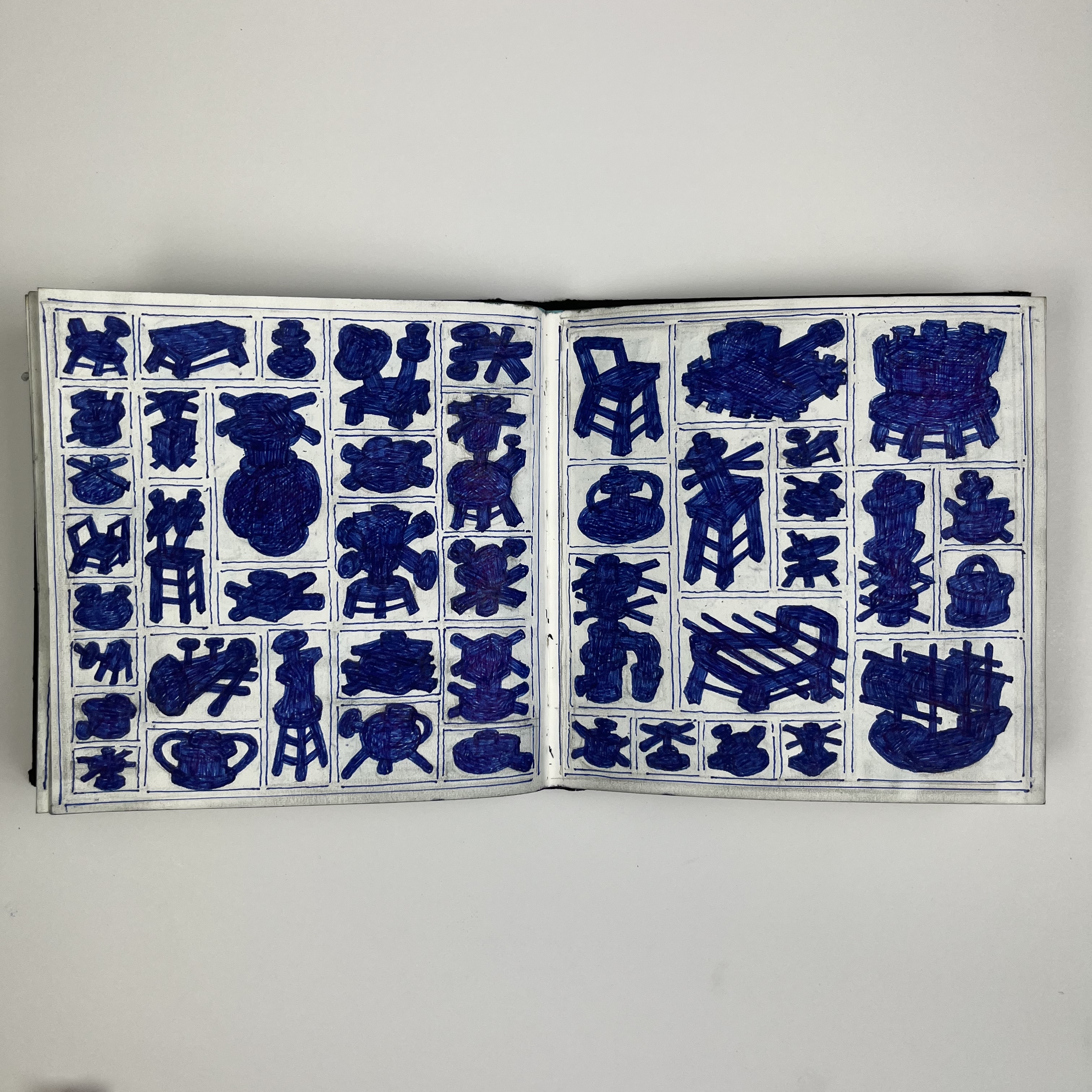 The embroidered canvasses engage with the use of visual tropes and languages associated with ID silhouette classification tables initially created in my sketchbook. Classification tables pervade through visual recognition methodologies across fields as diverse as military, ordinance, engineering, aeronautics, science and fashion, reducing the three-dimensional complexity of an object, identity, or form to an external outline from one perspective. In the sketchbook, these very personal, remembered, invented and imagined silhouettes are created through a furious process of scribbling to achieve the familiar expected solidity of a silhouette based language. This frenetic scribble drew me to engage with thread in terms of quality of line and the shared traditions of sewn and stitched badges, insignia, and identification. The intention is to map out shapes and forms with thread. Embroidery brings materiality and craft with associations to repetitive labour and stitch’s ability to express original ideas personally, not unlike handwriting or mark-making akin to the initial filling in of the silhouettes first generated in the sketchbook.