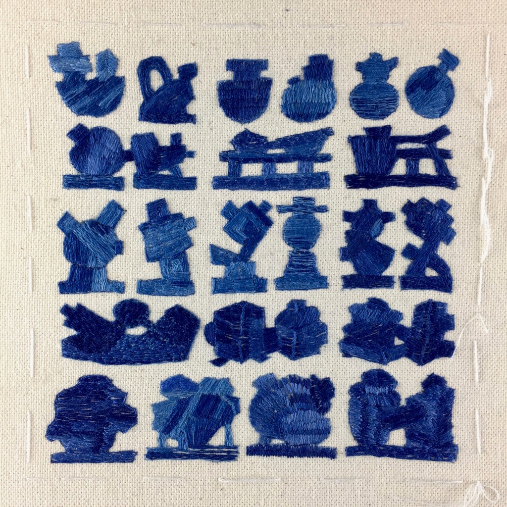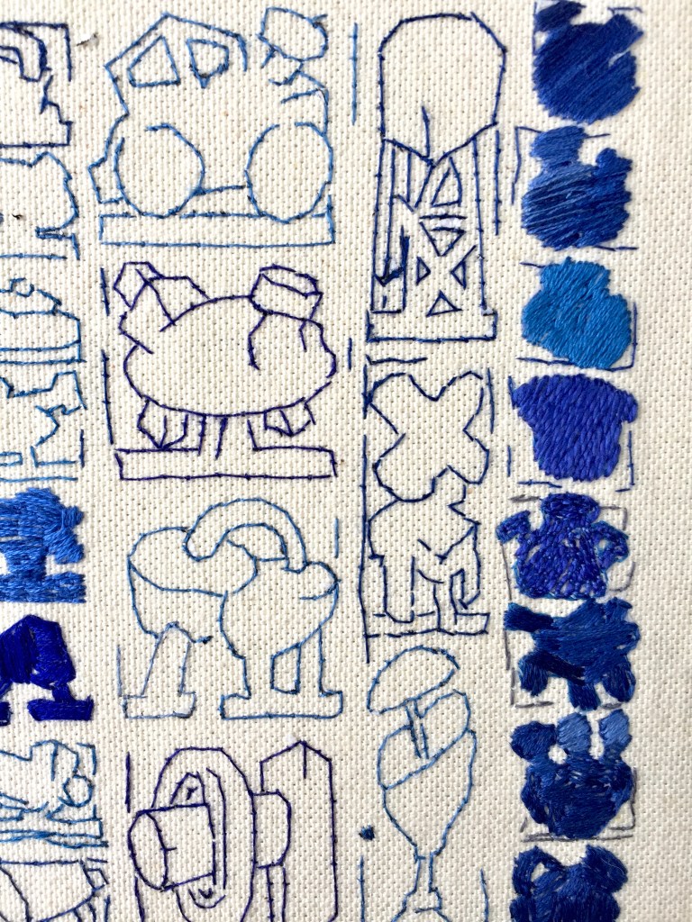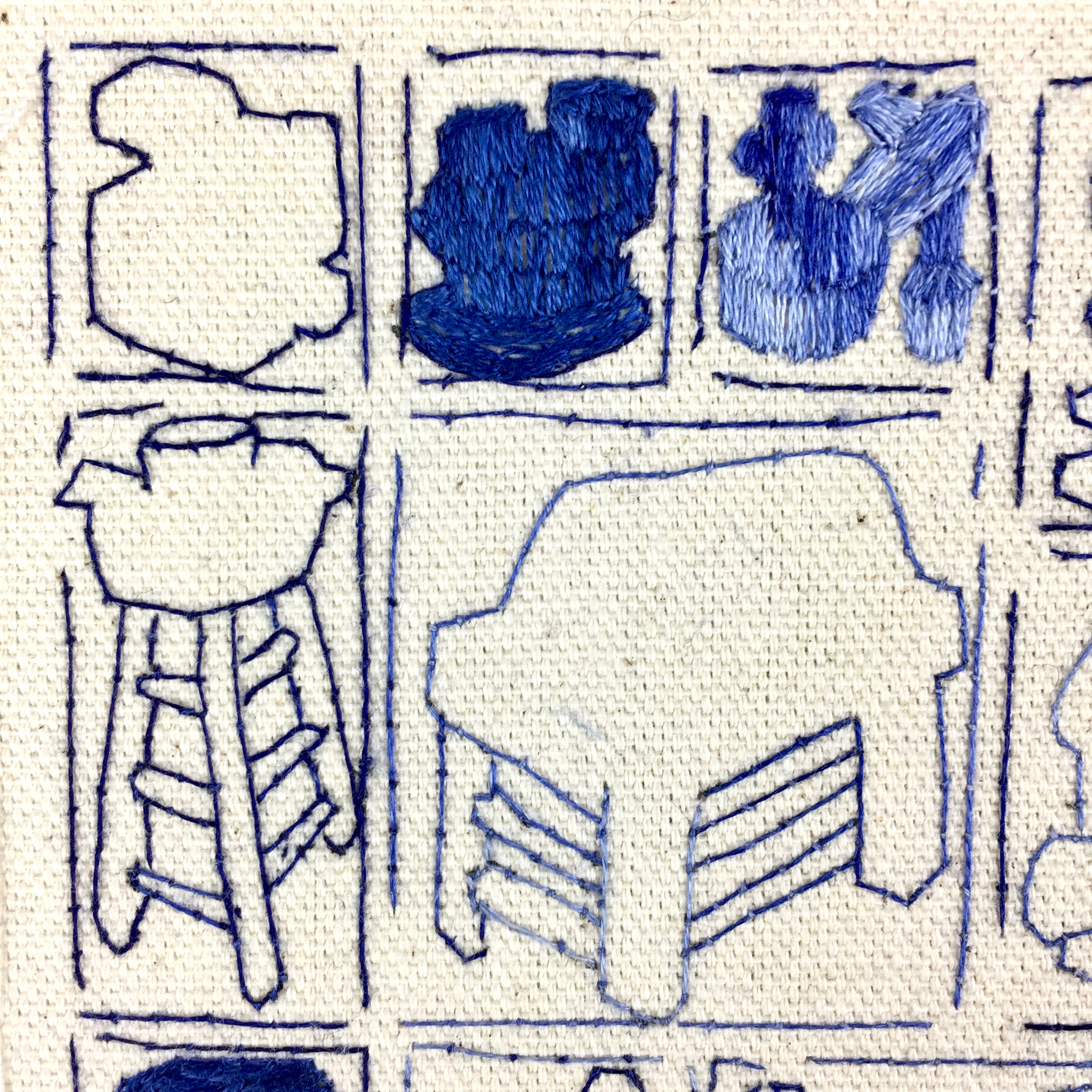 I am intrigued by how the generic or shared nature of the silhouette based systemic languages transcends and crosses cultural paradigms and historical chronologies, an element of identity also shared by the language of stitch. Embroidered stitches are handed down from generation to generation, family to family, the repertoire being added to by travellers returning from foreign countries. They were invented by accident or intent, gradually becoming an international language, the same basic stitches found in many parts of the world and different countries.