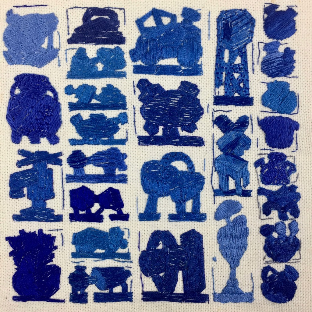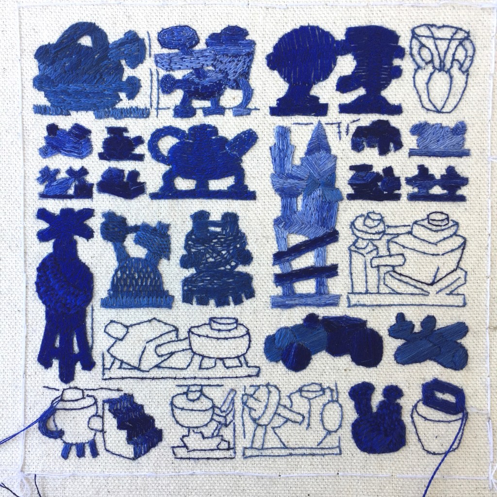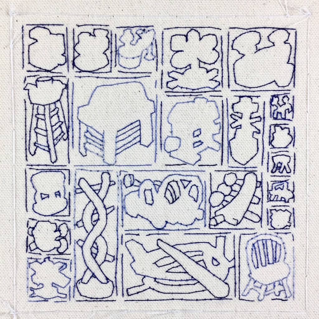 I am currently working on a series of nine 6 x 6-inch canvasses of constructed tables of embroidered objects. These will be exhibited alongside the second body of work developed as part of Fictions, a two-person exhibition with the artist Isabel Young at the Blyth Art Gallery at Imperial College London, in June 2022.
