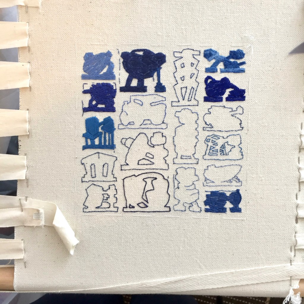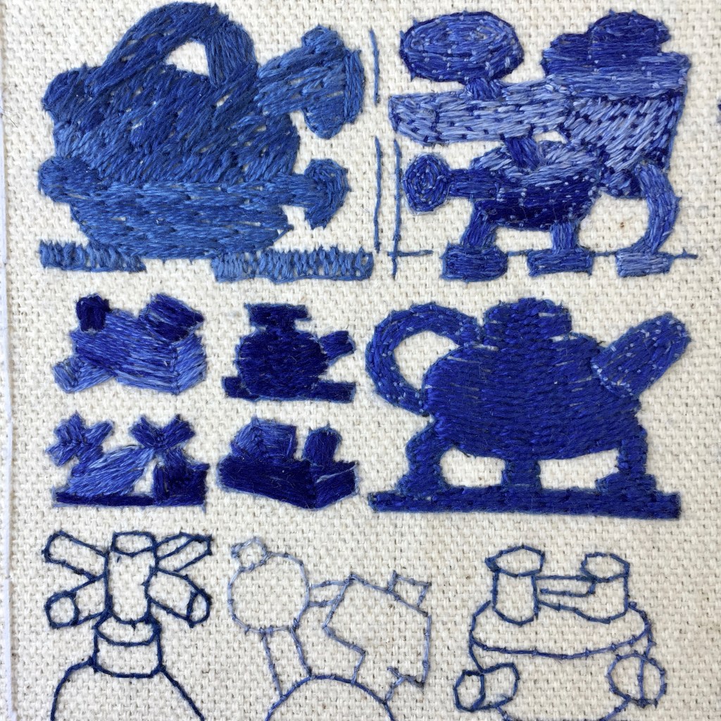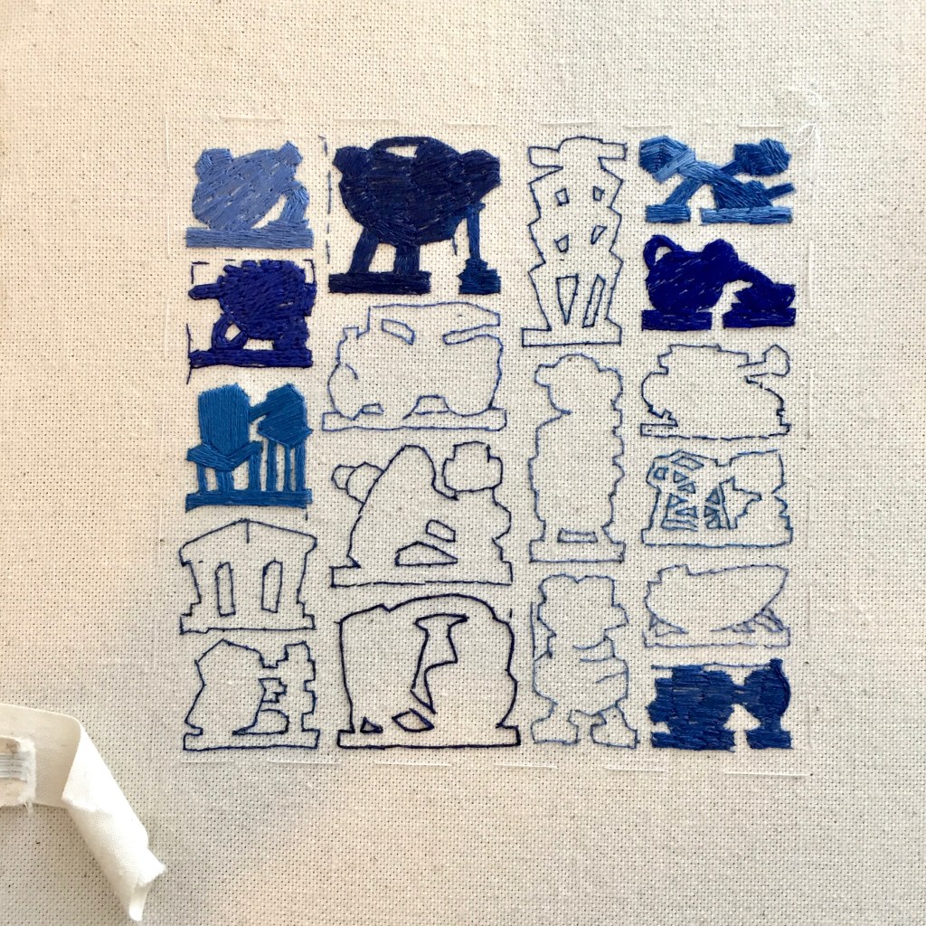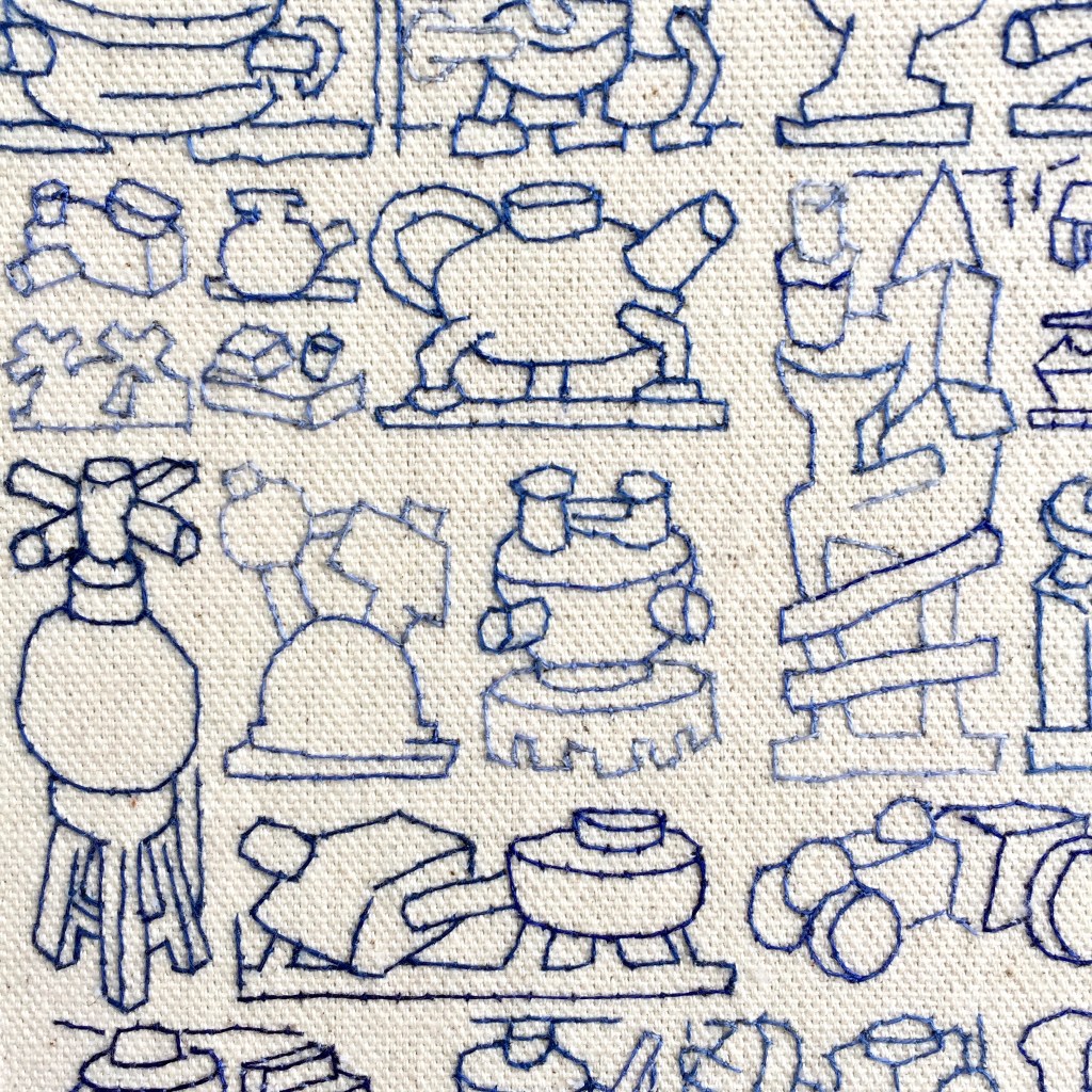 I am currently working on a series of nine 6 x 6-inch canvasses of constructed tables of embroidered objects. These will be exhibited alongside the second body of work developed as part of Fictions, a two-person exhibition with the artist Isabel Young at the Blyth Art Gallery at Imperial College London, in June 2022.