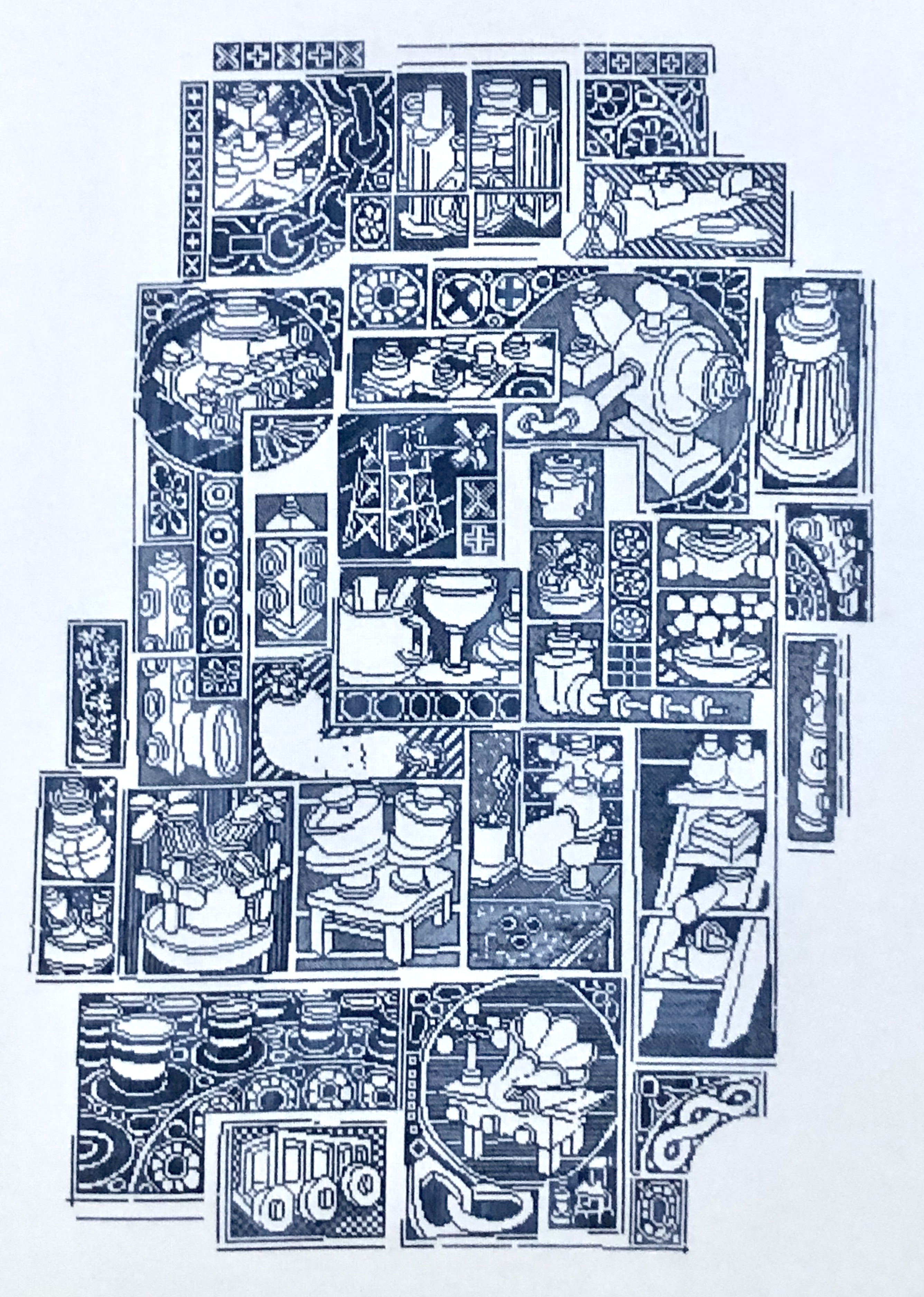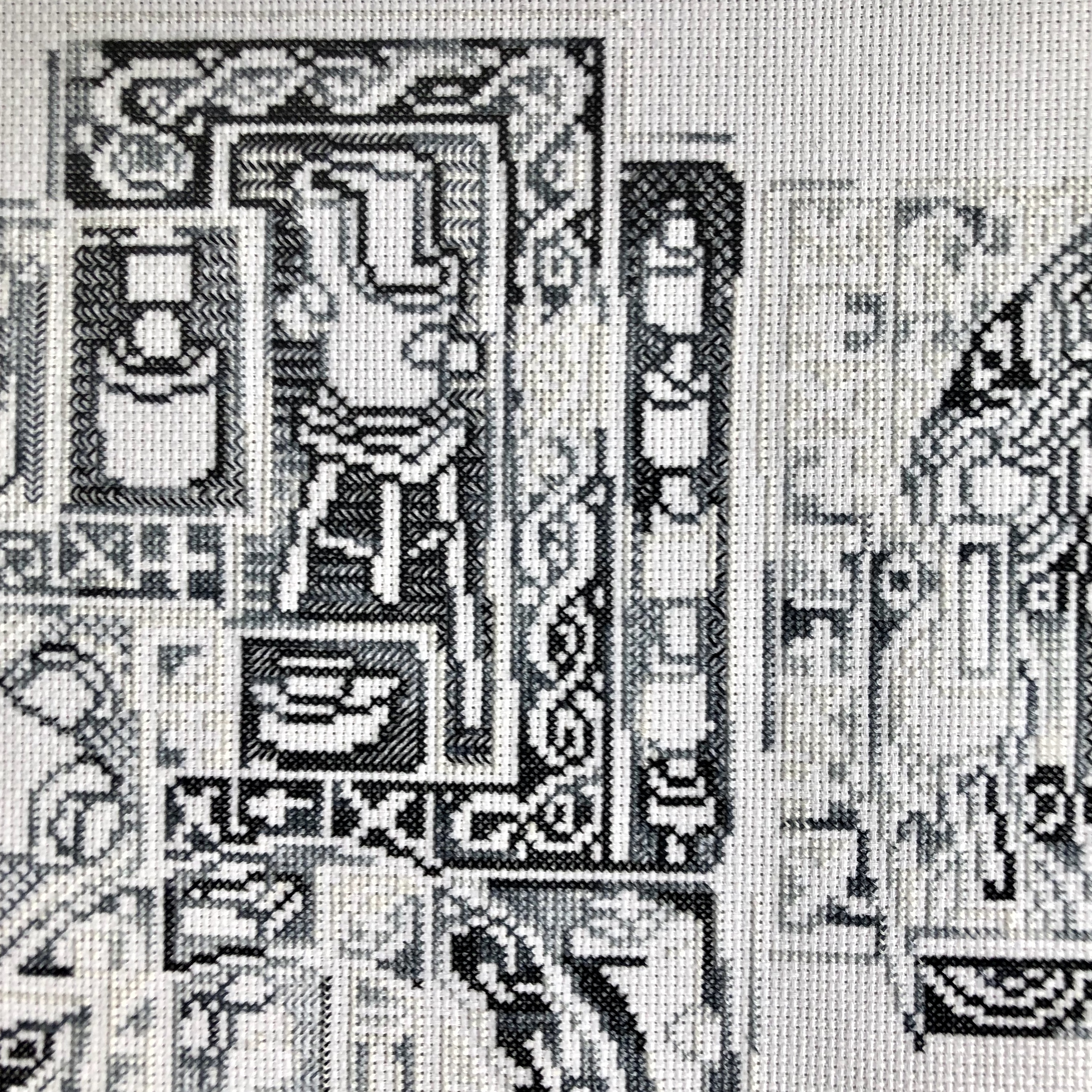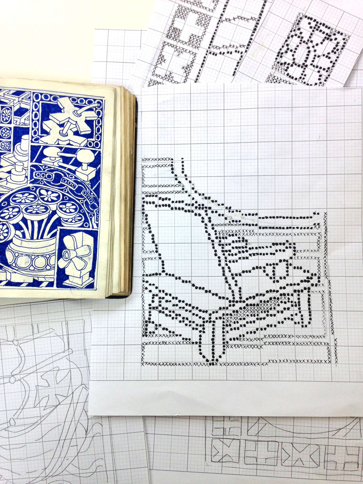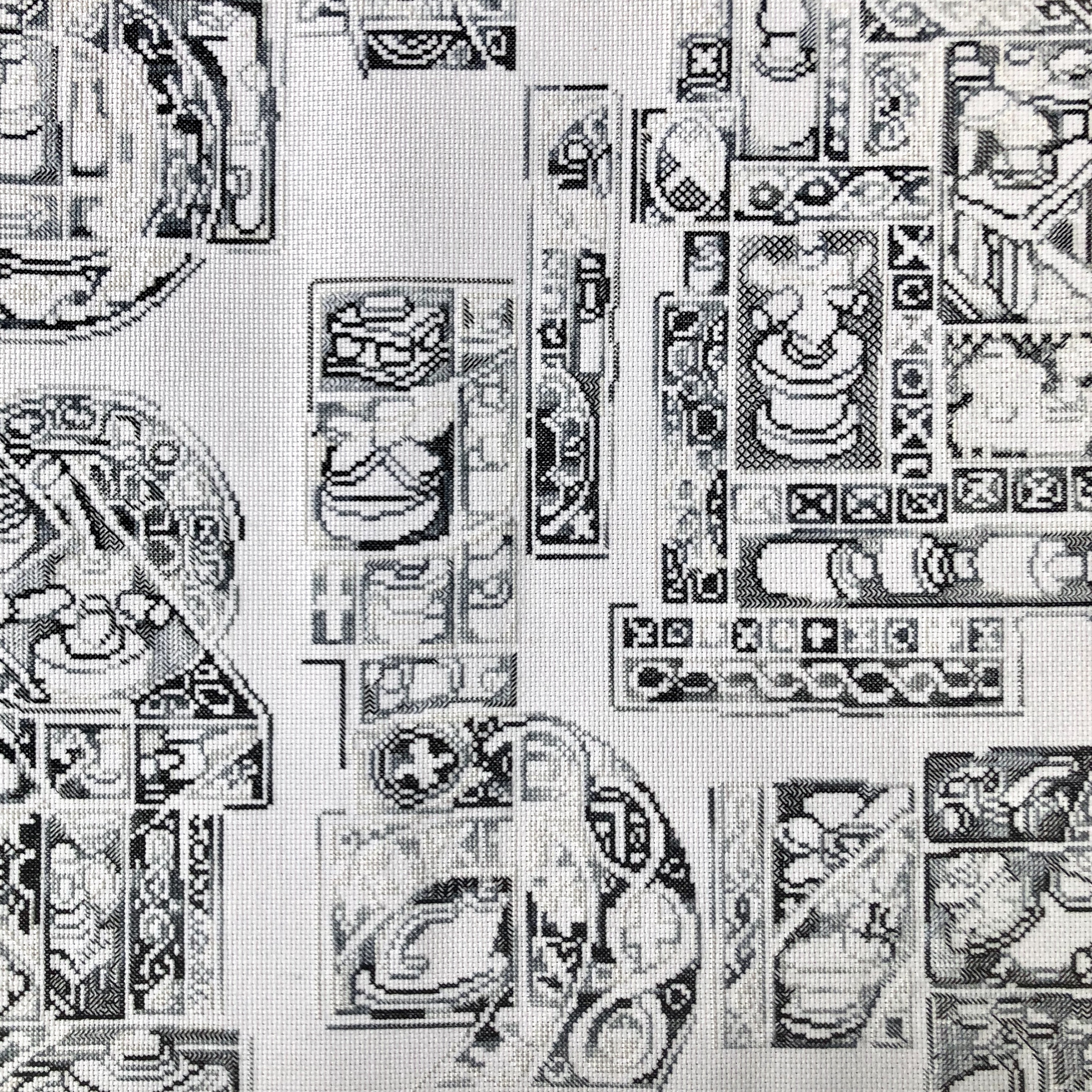 The resulting images are akin to hybrid comic strip-like dioramas, which interweave, combine and encapsulate remembered and speculative fragments, objects and apparatus, with decorative patterns. The patterns are drawn from cross-cultural sources as diverse as Celtic, Oriental, and 18th & 19th-century European decorative languages and traditions. The samplers emerge and develop intuitively. Different blocks and components are added and tessellated together, forming an intuitive composition speaking to the extended time-based nature integral to the traditions of samplers and narrative storytelling embedded in the global practices of craft. The works have an inbuilt fragmented or fractal quality, brought about through pictorial random generation instigated by the limitations and unpredictability of the variegated thread.
