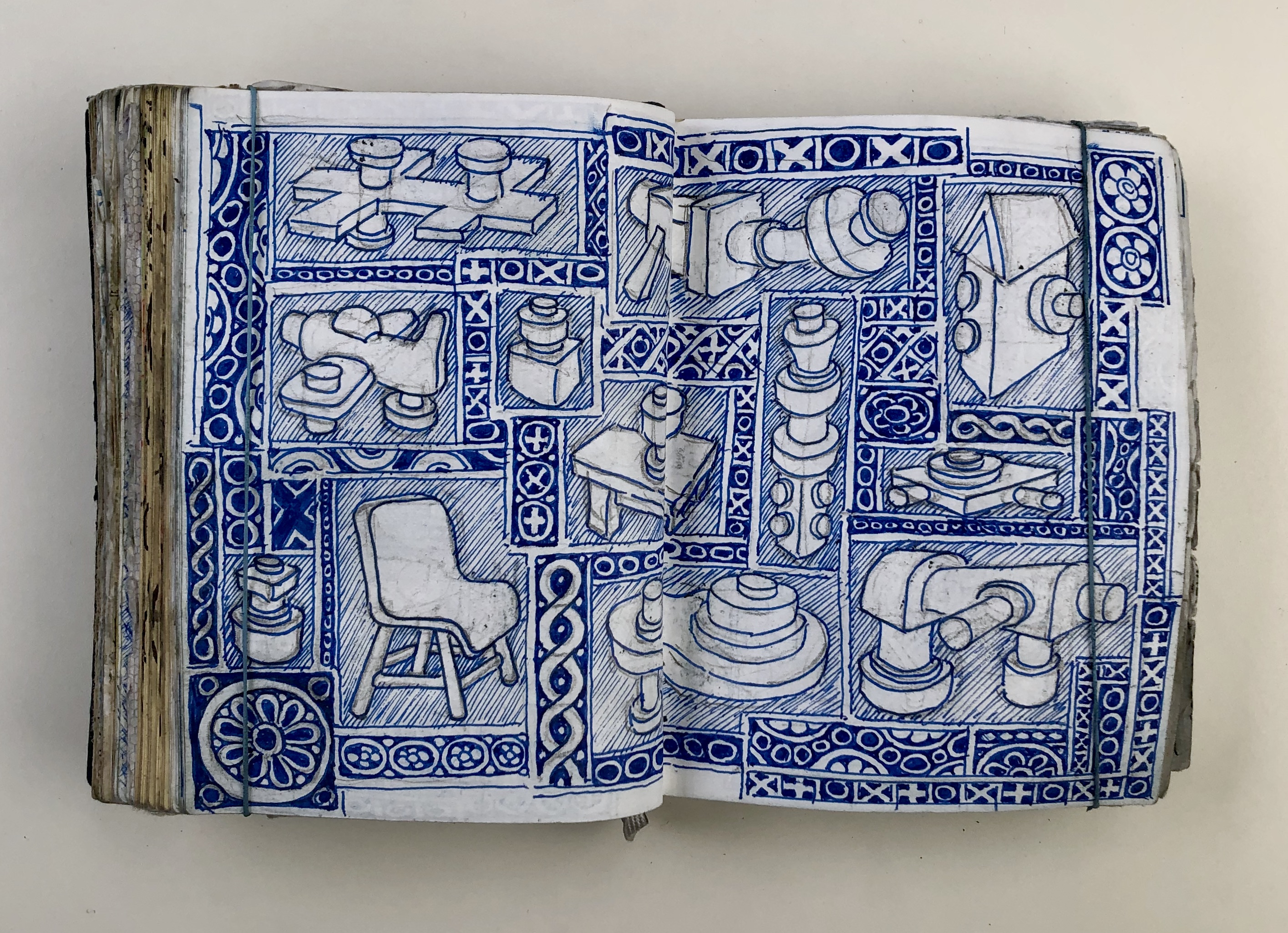 My research and visual referencing have always drawn from a broad range of starting points, including museum collections, found and encountered objects, artefacts and fragments. These references are collected and transcribed through my sketchbook. The sketchbook is a space allowing me to develop, investigate and navigate notions around shared narratives, conversations and mythologies. Visually collecting, collating the observed, recorded and remembered narratives, essential in the global art and craft lexicon my practice inhabits.