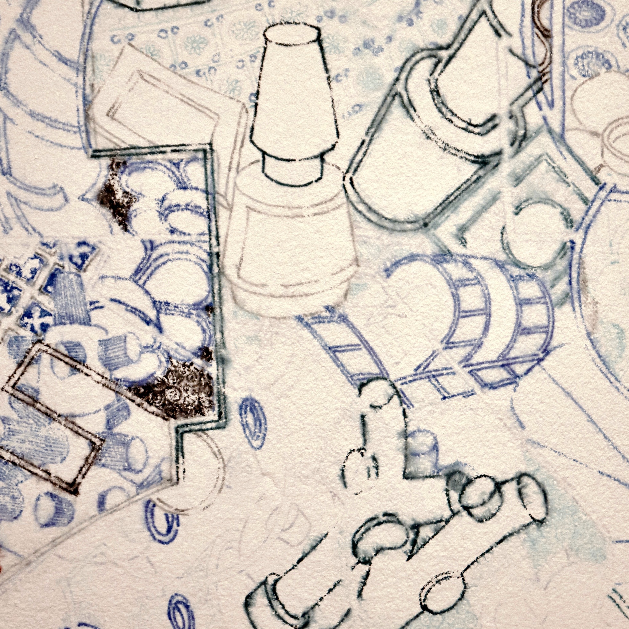 A key influence was the rationale and thinking embedded in the Trace Engines body of work and research. Trace Engines was a body of works on paper created during a residency in China in 2015. The term trace related to residues left behind, engine referring to the notion of drawing as an act and device to transitioning from one state or place to another. The nature of variants of tone and colour of inks brought about by repeated and straightforward actions of dabbing drawings with cloth and water, disrupting and destroying the paper fibres to release the ink on to a different surface, leaving a complex yet defused residue. The intention was to interrogate and investigate these inherent possibilities and aesthetic of chance through more three-dimensional and potentially rigid or mechanical language and the process of cross stitch. I responded to observations of the variation in colour, tone and intensity of thread concerning time passed, inconsistencies in the dying and qualities of threads I encountered in examples I was drawn to in museum collections and forgotten corners of charity shops. Translating and exploring chance and variation by employing variegated cotton threads to break up and challenge the consistency and expected accuracy of the cross-stitch process. The embroidery thread’s inherent variance also mirrored the transitory nature and consistency of focus and resolution in the residue drawings of Trace Engines. The cross-stitch brought additional connections and qualities of pixilation associated with more familiar and expected digital and analogue traditions of print and image-making – narrative traditions which are associated with the graphic novel, photographic and film-based practices of collecting, collating, and preserving shared stories, histories, and memories.