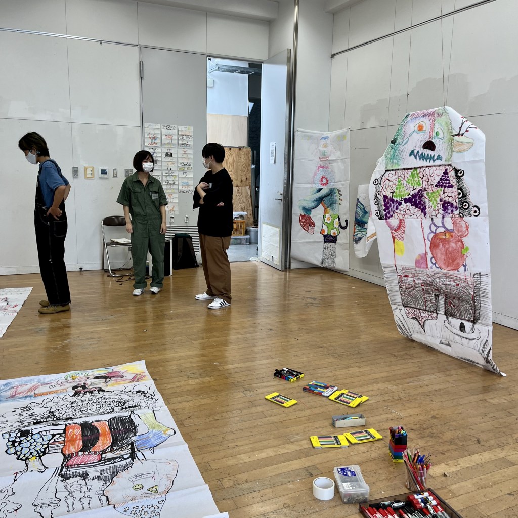 The workshop on day one began with introductions and investigations into and around paradigms related to the Surrealist drawing exercise “Cadavre Exquis” – the exquisite corpse, to both incite and explore group and collaborative working and practice. We started with a quick practical introduction to the premise of the exquisite corpse or the familiar western game of picture or word-based consequences. We approached the premise through images, working with a page divided into five sections. Each person completed a section, and the drawing was passed to another participant. In turn, they drew using the last marks visible as a starting point; this grounded the concept and activity. In the next part, we approached this again, though increasing to a scale closer to the proportions of the human figure human scale, working collectively in groups of five on traditional Japanese dividing screen paper. Students were asked to respond intuitively to the previous marks, remnants of image and colour, the prefix of the five broad sectioning of the body, head, chest and shoulders, stomach and hips, thighs and knees, and finally ankles and feet.