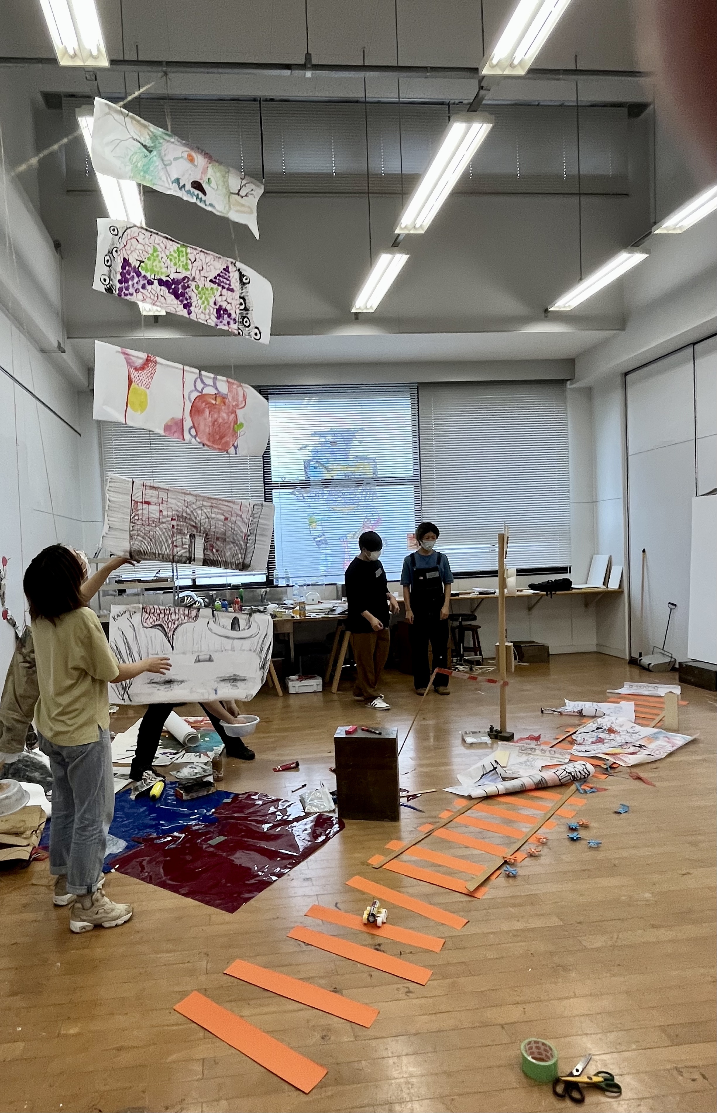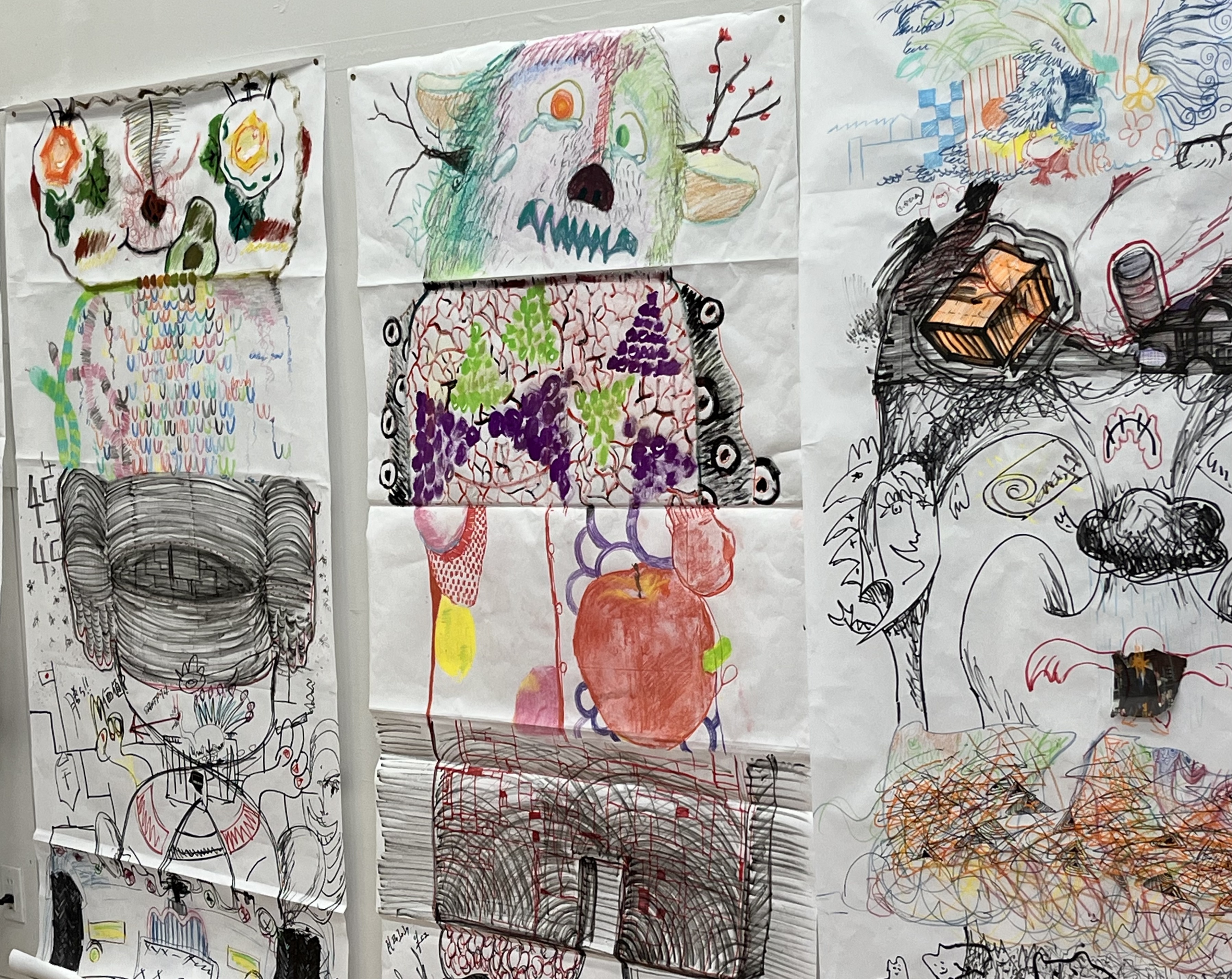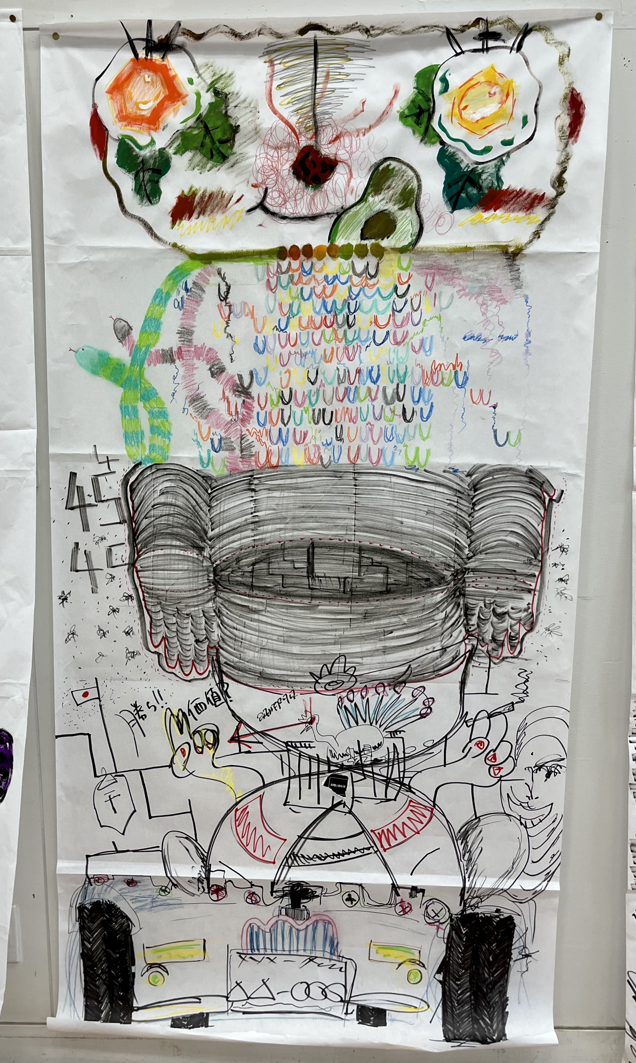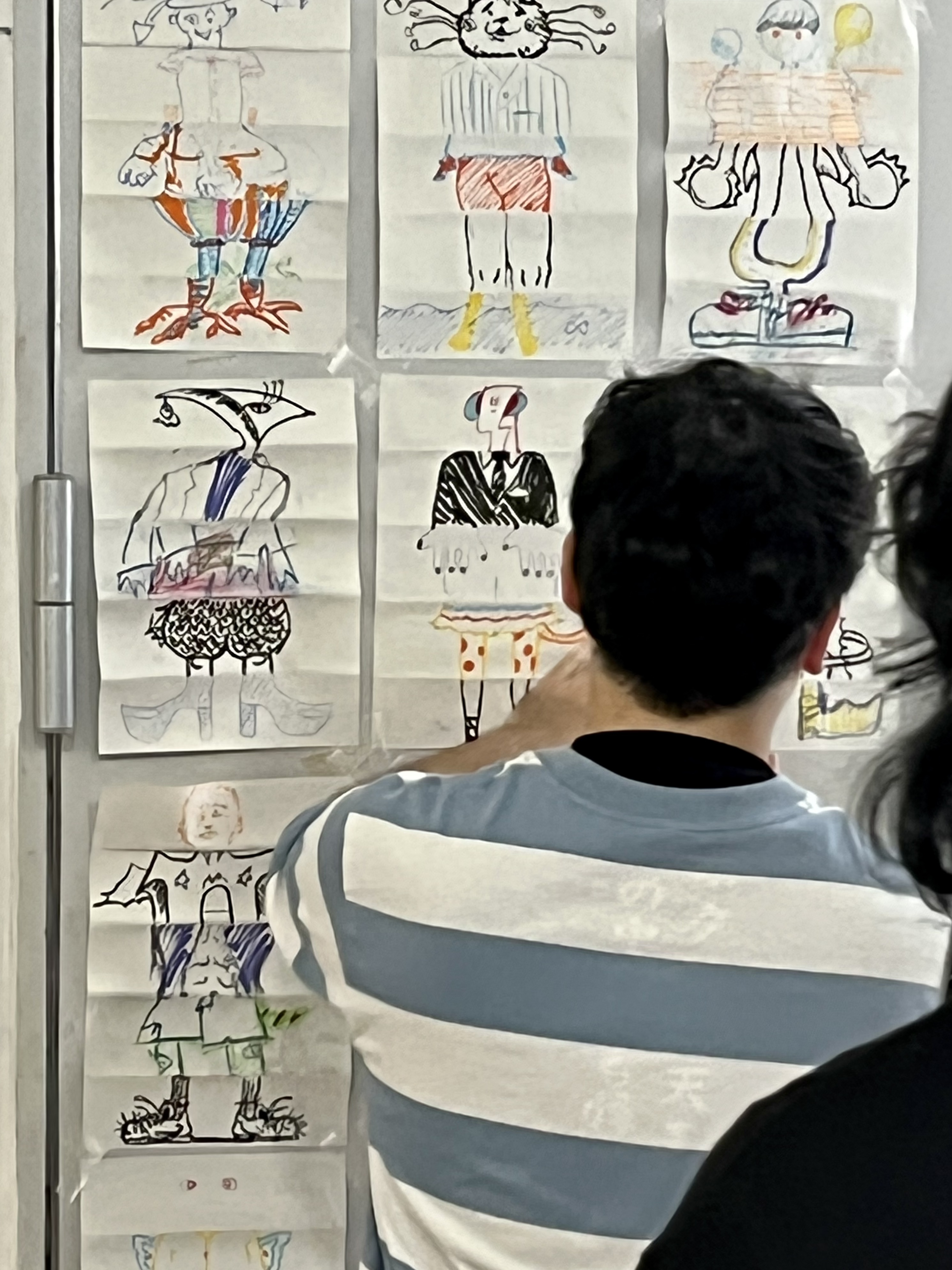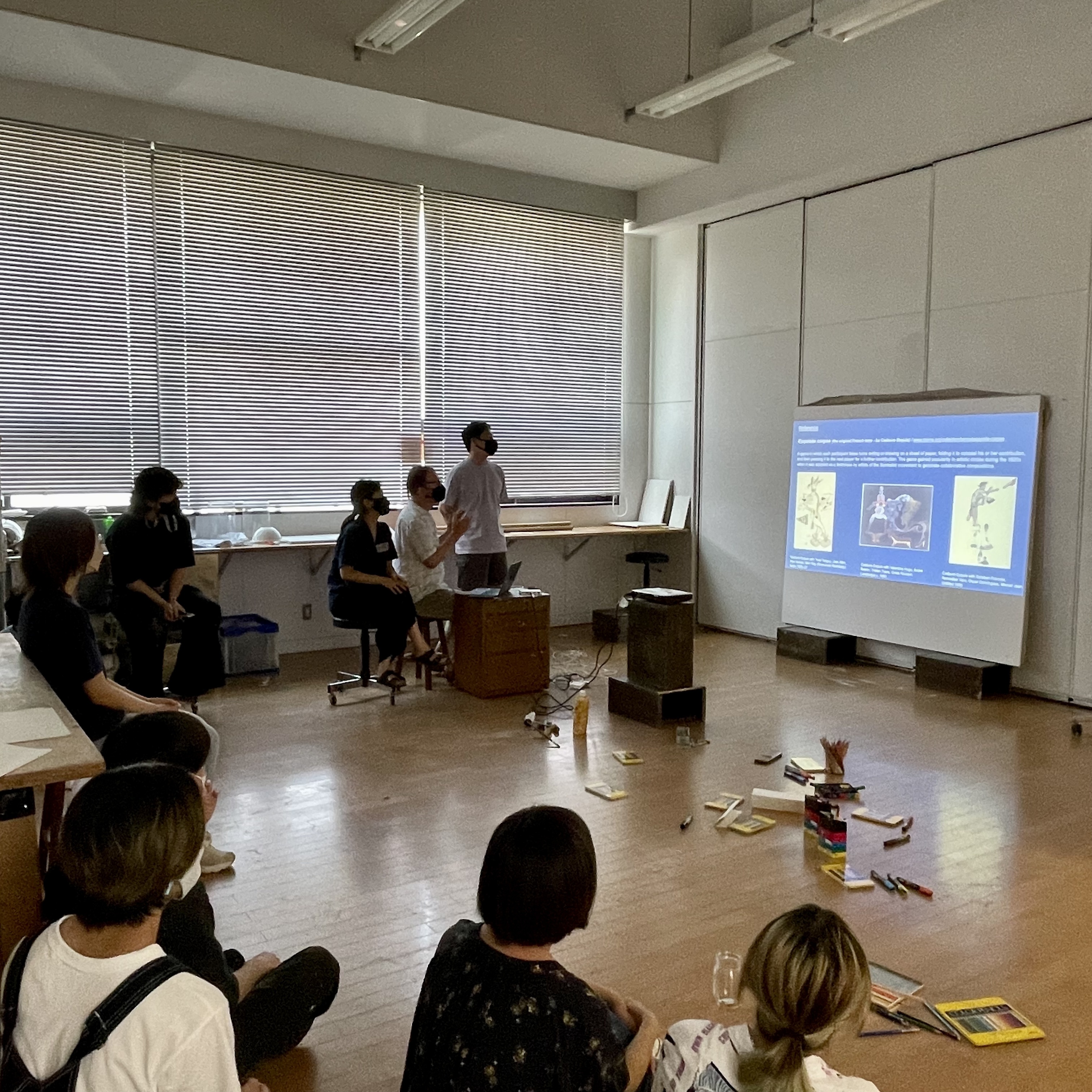 The workshop on day one began with introductions and investigations into and around paradigms related to the Surrealist drawing exercise “Cadavre Exquis” – the exquisite corpse, to both incite and explore group and collaborative working and practice. We started with a quick practical introduction to the premise of the exquisite corpse or the familiar western game of picture or word-based consequences. We approached the premise through images, working with a page divided into five sections. Each person completed a section, and the drawing was passed to another participant. In turn, they drew using the last marks visible as a starting point; this grounded the concept and activity. In the next part, we approached this again, though increasing to a scale closer to the proportions of the human figure human scale, working collectively in groups of five on traditional Japanese dividing screen paper. Students were asked to respond intuitively to the previous marks, remnants of image and colour, the prefix of the five broad sectioning of the body, head, chest and shoulders, stomach and hips, thighs and knees, and finally ankles and feet.