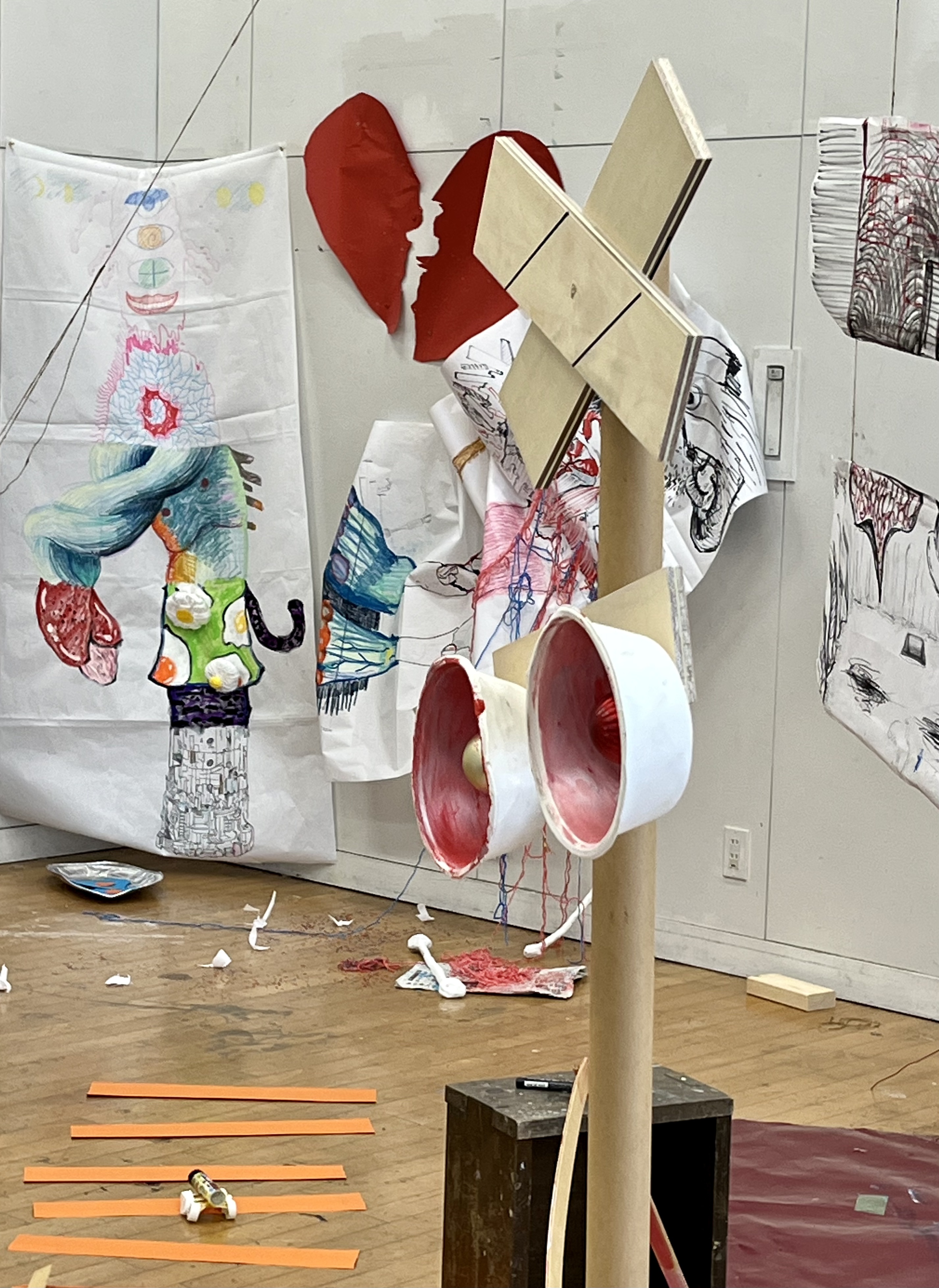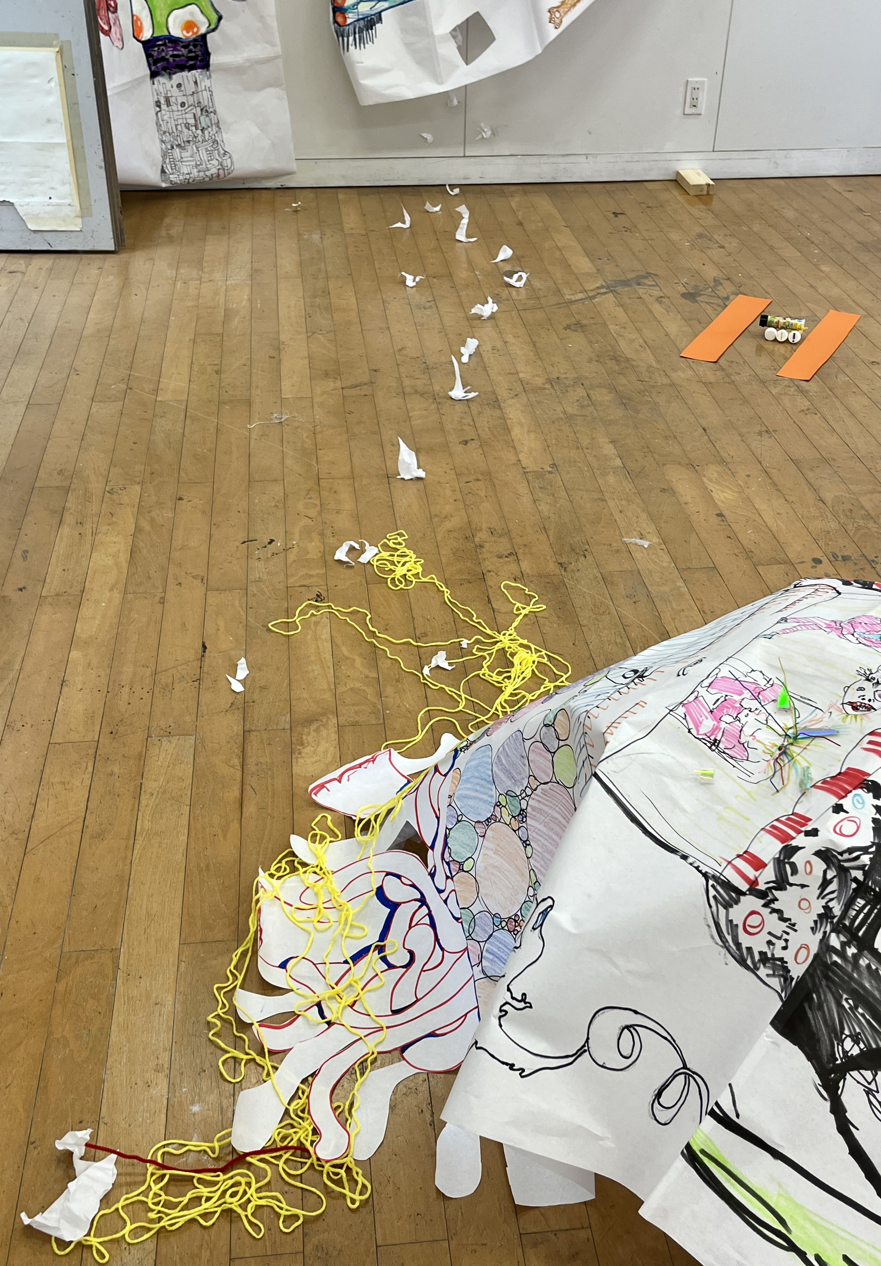 On day two, students remained in the same groups. First, they were asked to take their 5-6 sectioned collective drawings and situate and/or curate them in the studio space. Then, in line with the previous day, use them as a starting point to continue and/or build from, though this time, a two-dimensional space into the three-dimensional reality of the studio space. Students were provided with a range of materials, paper, found wood and cardboard, string, tape and fabrics. The main focus here was the shift on practice which now included negotiated learning and practice. Students moved away from individual contributions to a whole. They engaged fully with a shared collaborative approach, looking at dialogue between authorship, ownership and cultural location taken from the original drawings.