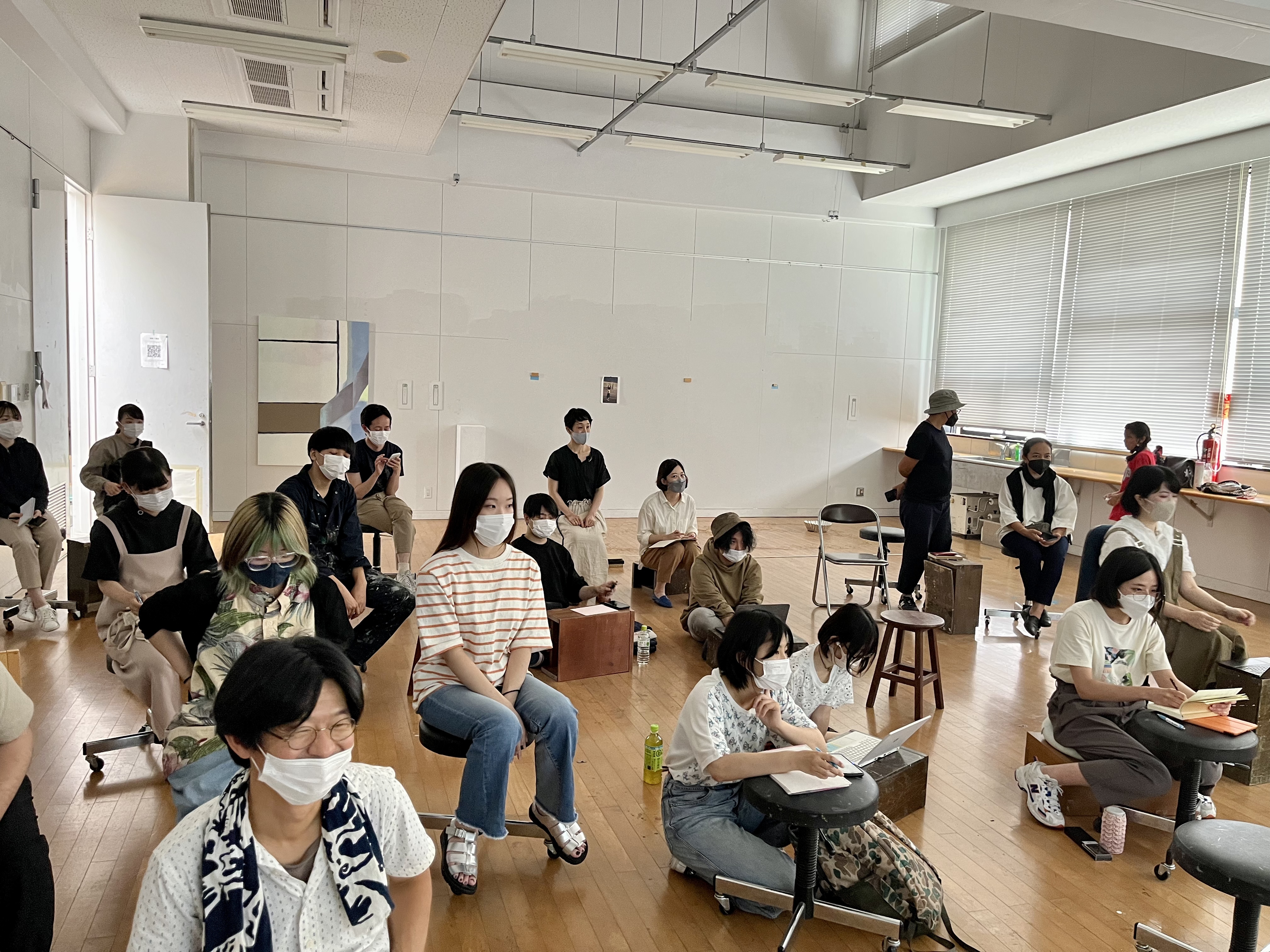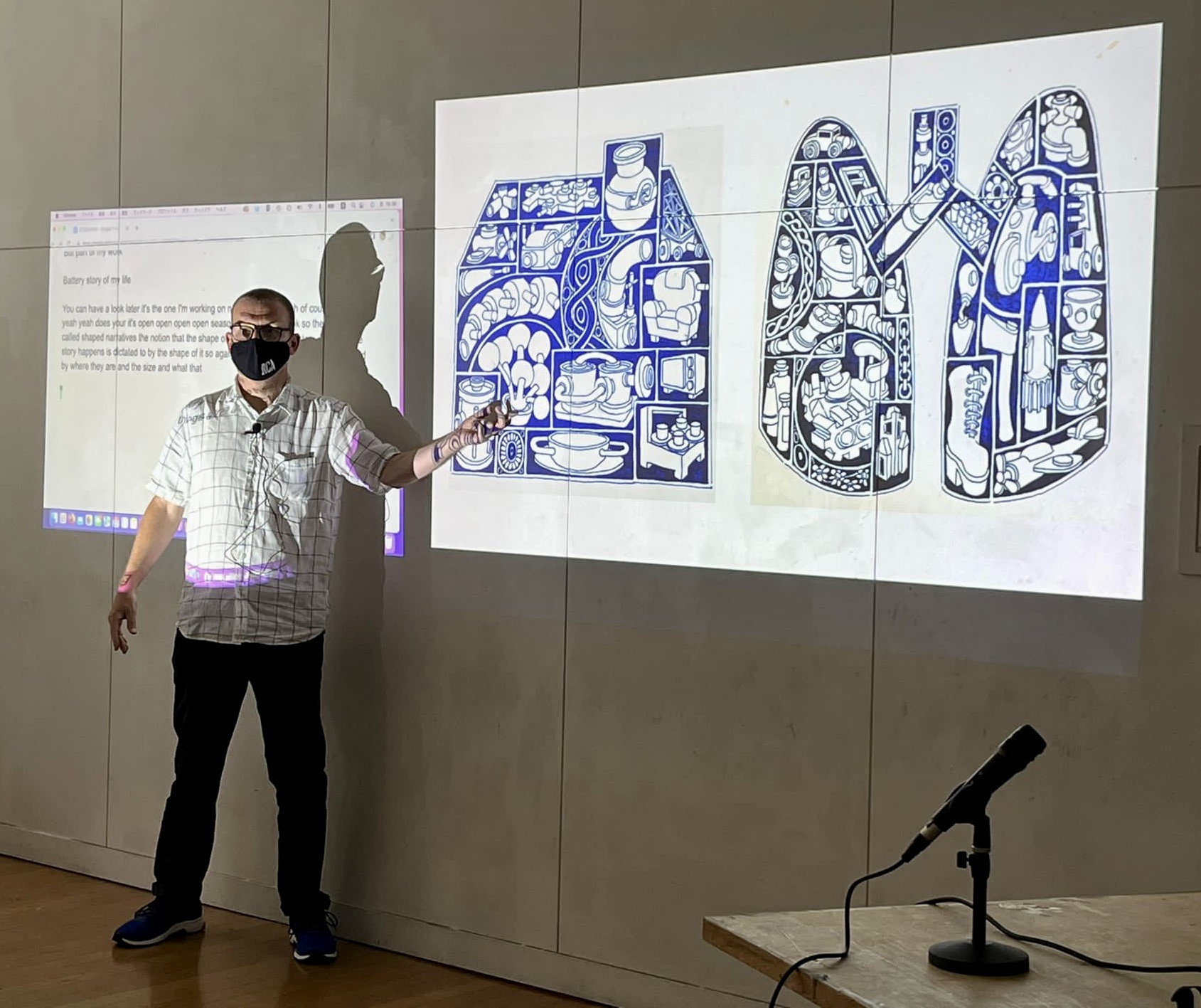 As part of the residency, Dr Kyung Hwa Shon and I had studio provision within the art department of Onomicho City University. We engaged with the student community in various sessions and approaches throughout our stay. The first was a lecture on practice and an introduction to the RE- & DE- research project with Kyung Hwa Shon and myself, convened and supported by Yutaka Inagawa and Tamaki Ono. We delivered a presentation situating our practice and relating it to the RE- & DE- project and exchange element. The translation was supported by Associate Professor Yutaka Inagawa. There was an audience of thirty to forty BA and MA students, professors, curators and local and international artists.