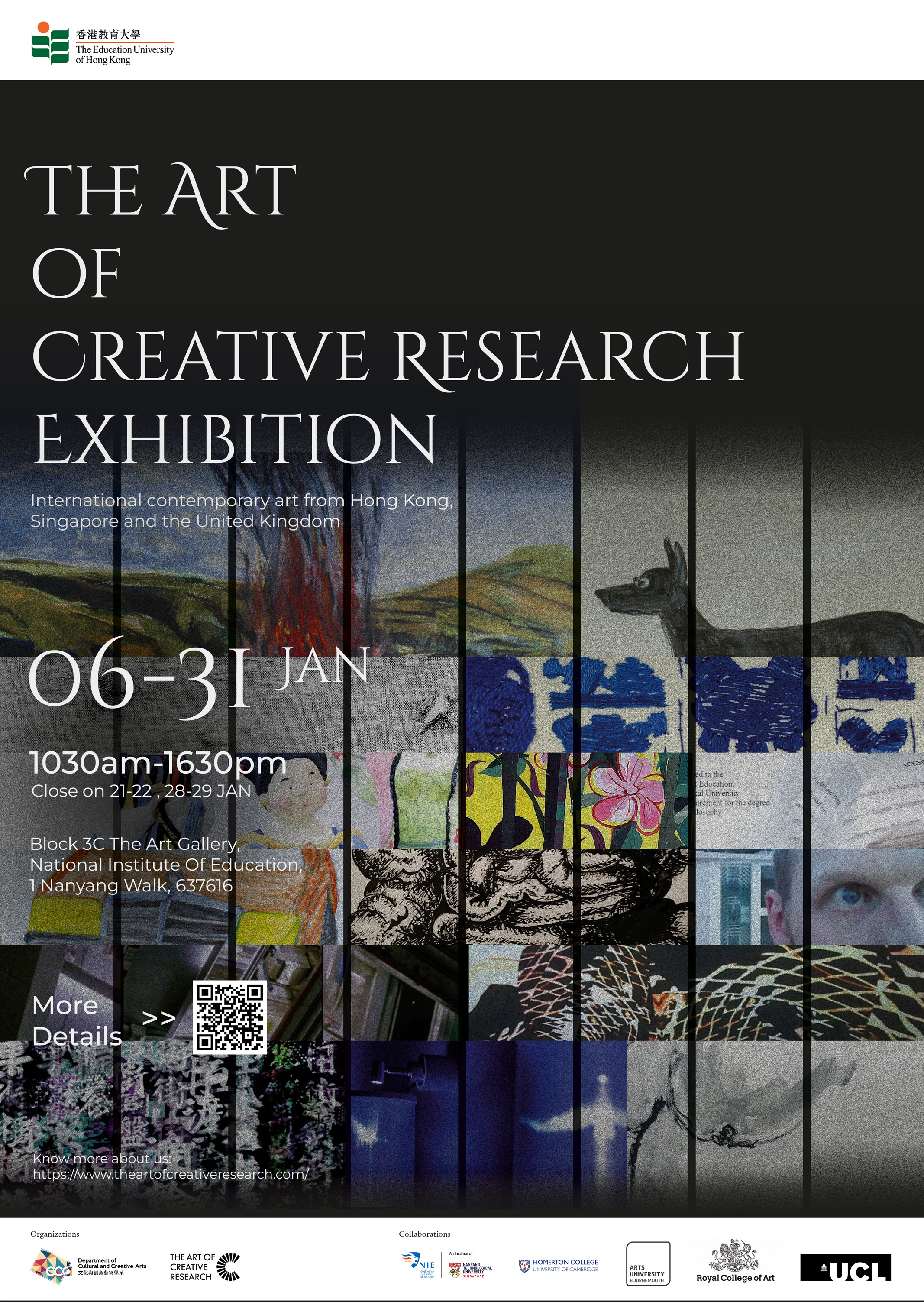 The Art of Creative Research features artworks in a range of media by fifteen international creatives from six influential Universities: The Education University of Hong Kong, the National Institute of Education (NTU) Singapore, and from the UK: the Arts University Bournemouth, the Royal College of Art, Homerton College (University of Cambridge), and University College London.