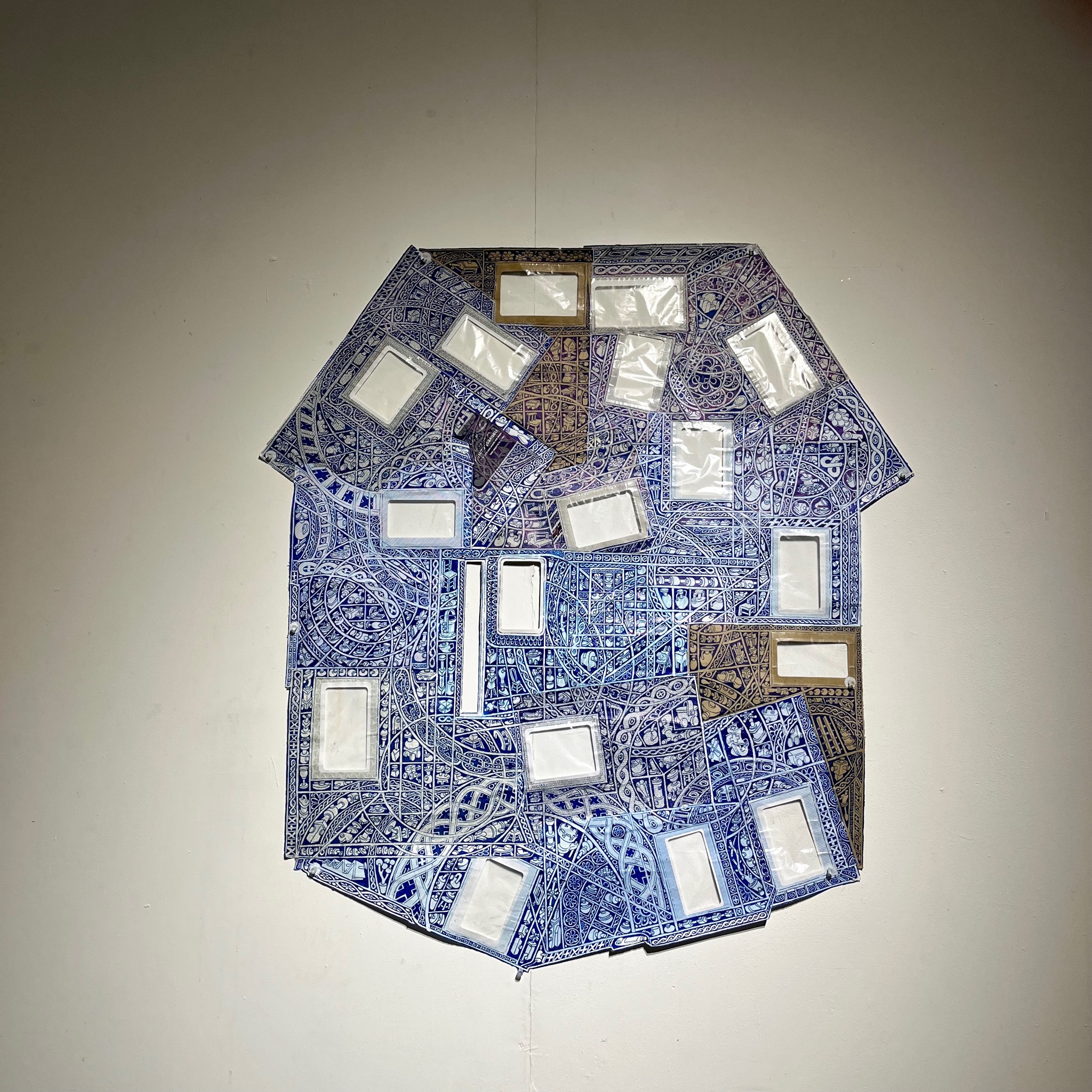 The second large-scale drawing is – Morié-Iè. Iè is the Japanese word for a house. Instead of the previous focus on landscape, this drawing centred on a specific construct or icon of a house or home. The initial ground was constructed from re-used windowed envelopes joined together to the outline of a generic house shape or silhouette; this was a multiple envelope construction, with mixed widow orientation, in many ways resembling the packaging or wrapping of an object. The fabrication process was no longer a visible component of the drawn framework. In this work, initial grids were formed through direct response to boundaries created through the juxtaposition of envelopes and response to constructed lines from original paper folds and seams. The semi-relief based nature of the constructed envelopes was combined with more three-dimensional linear references to house-based profiles taken from adjacent houses and the surrounding area. The grids were used to form hybrid visual forms and commentary focusing on the internalised nature of contents, and how contents define and narrate spaces and their surroundings, questioning these objects’ perceived existence, hierarchy or function previously as subordinate shapes or spaces, they exist within.
