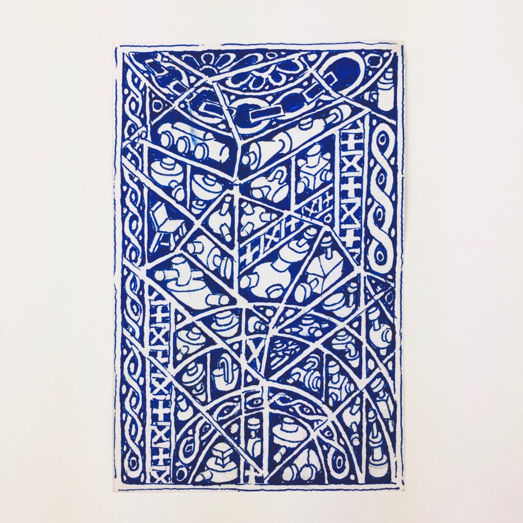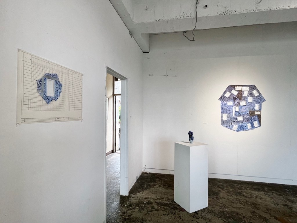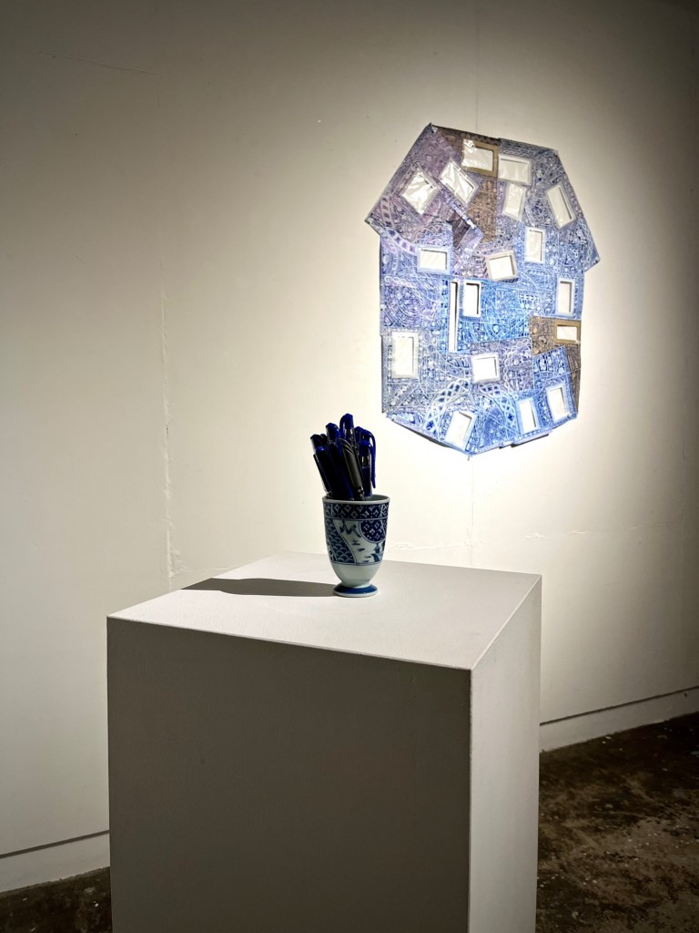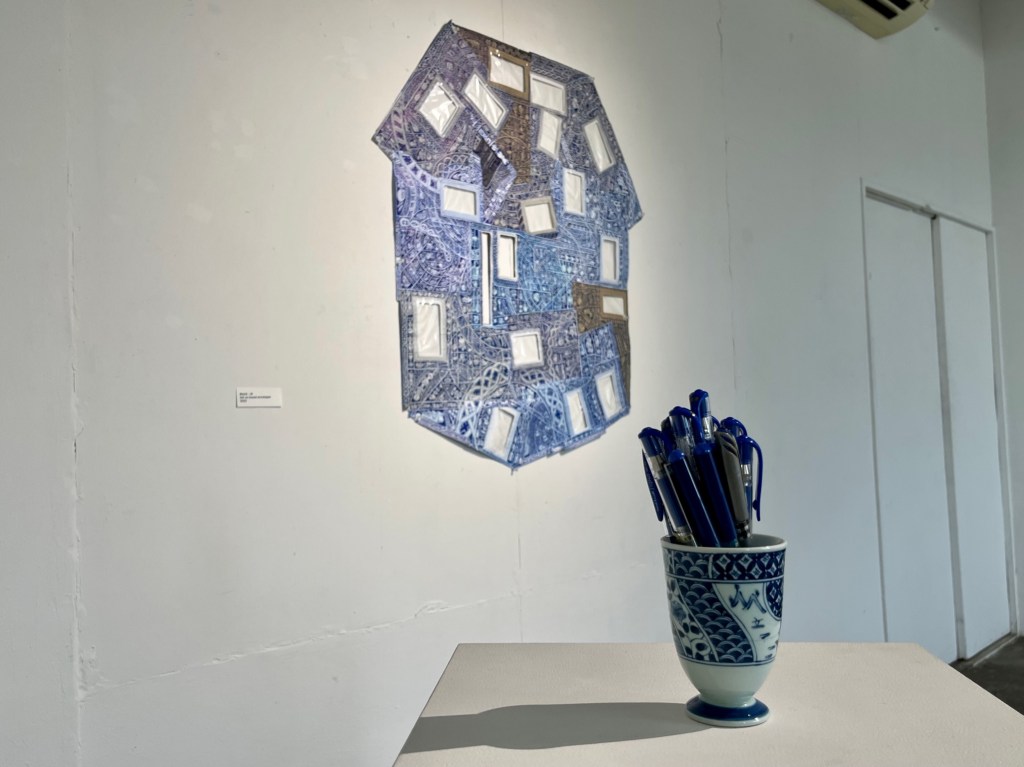 The second of these residual works was Spent, a small blue and white patterned ceramic vase appropriated from the Hono-ie residency space. This small vase became the receptacle for all the used blue pens used on the drawing and construction of all work produced in the twenty-eight days of the RE- & De- residency in Onomichi, in July/August 2022. Spent was situated on a plinth adjacent to Moiré-Iè at the entrance to Ichi-Ni-San-Shi-Dōzo, fulfilling two very different roles or functions, either as a dispenser or repository.