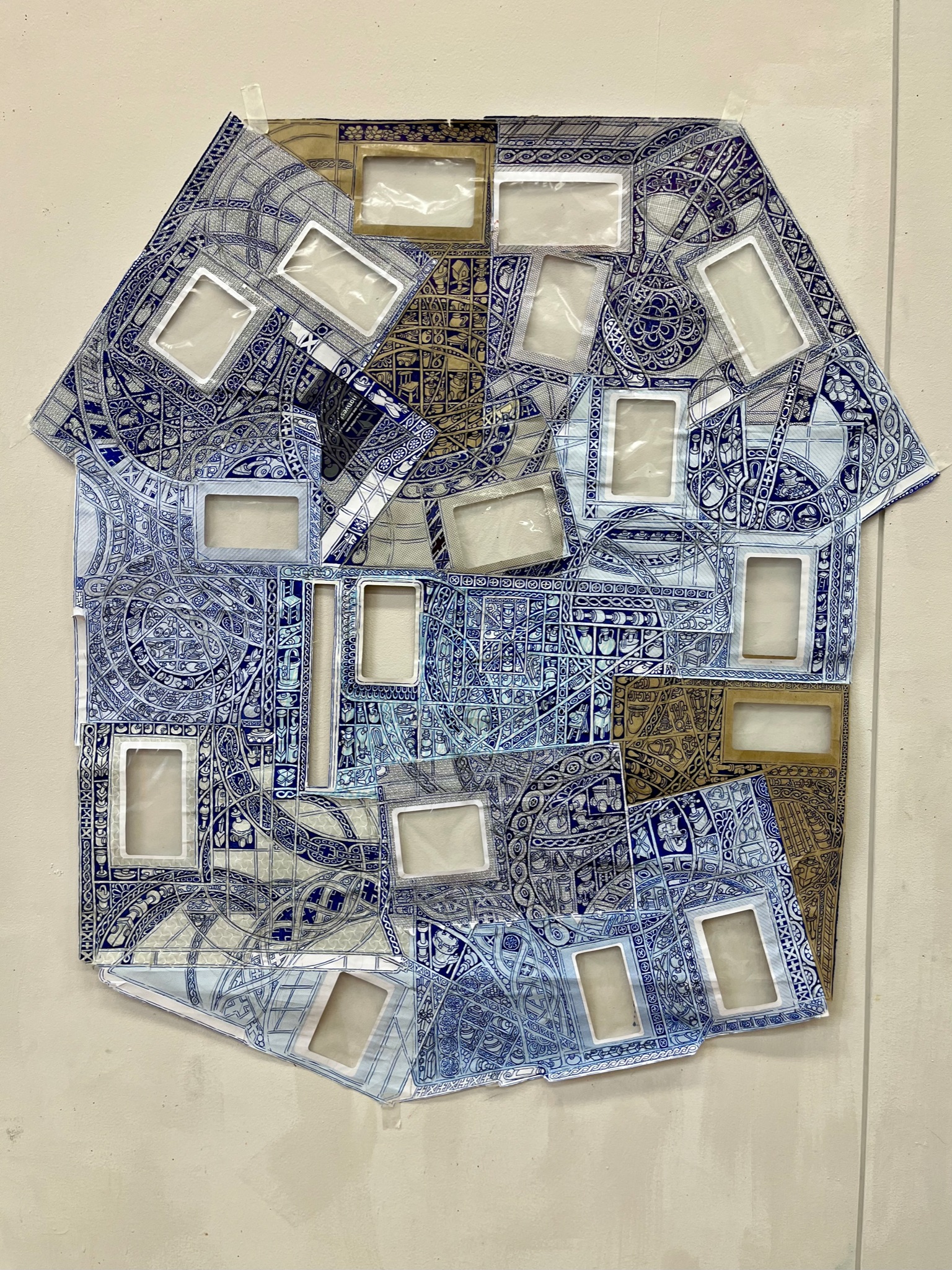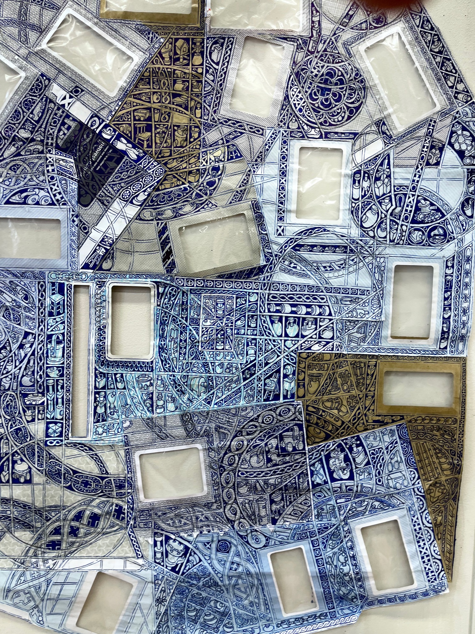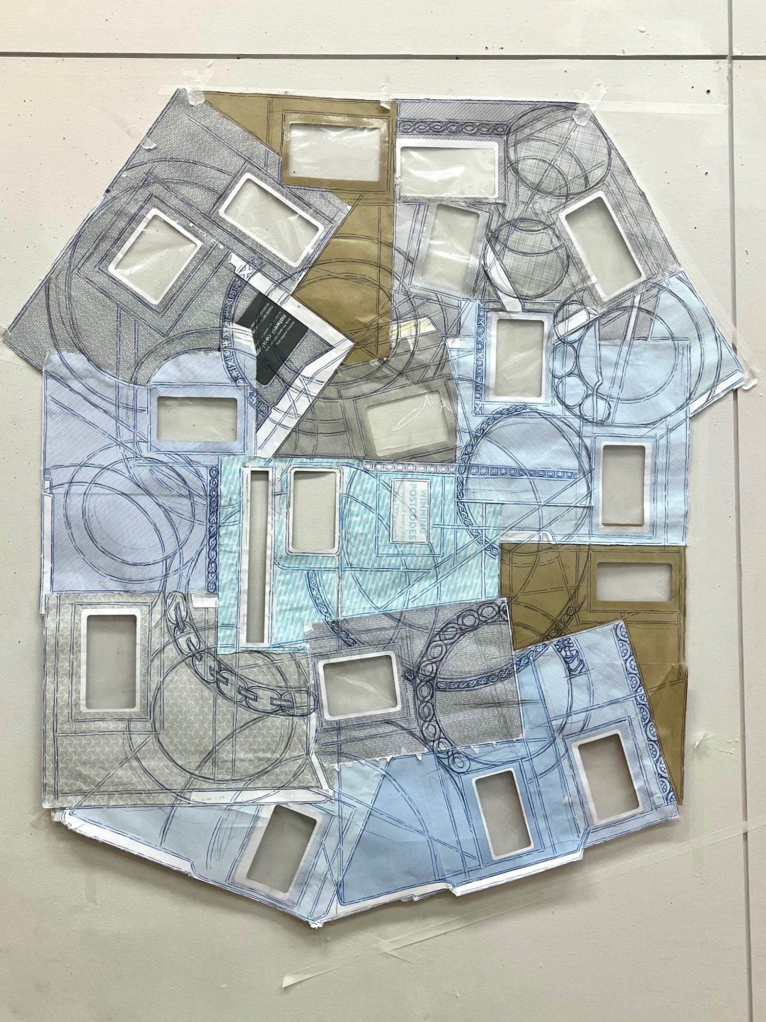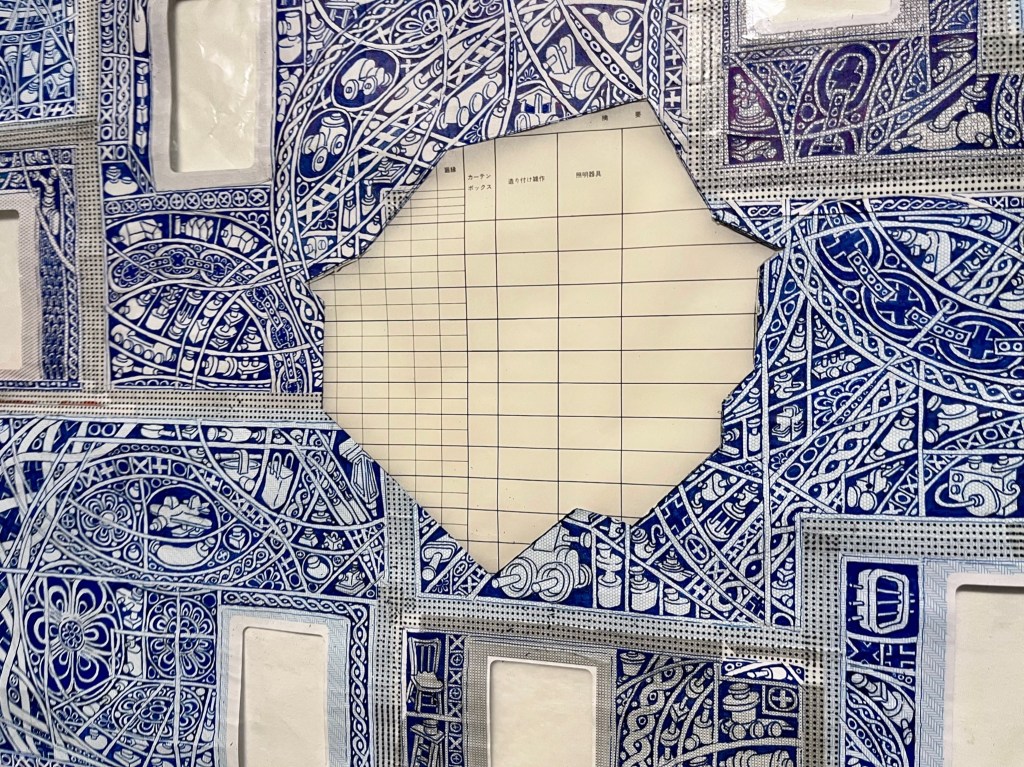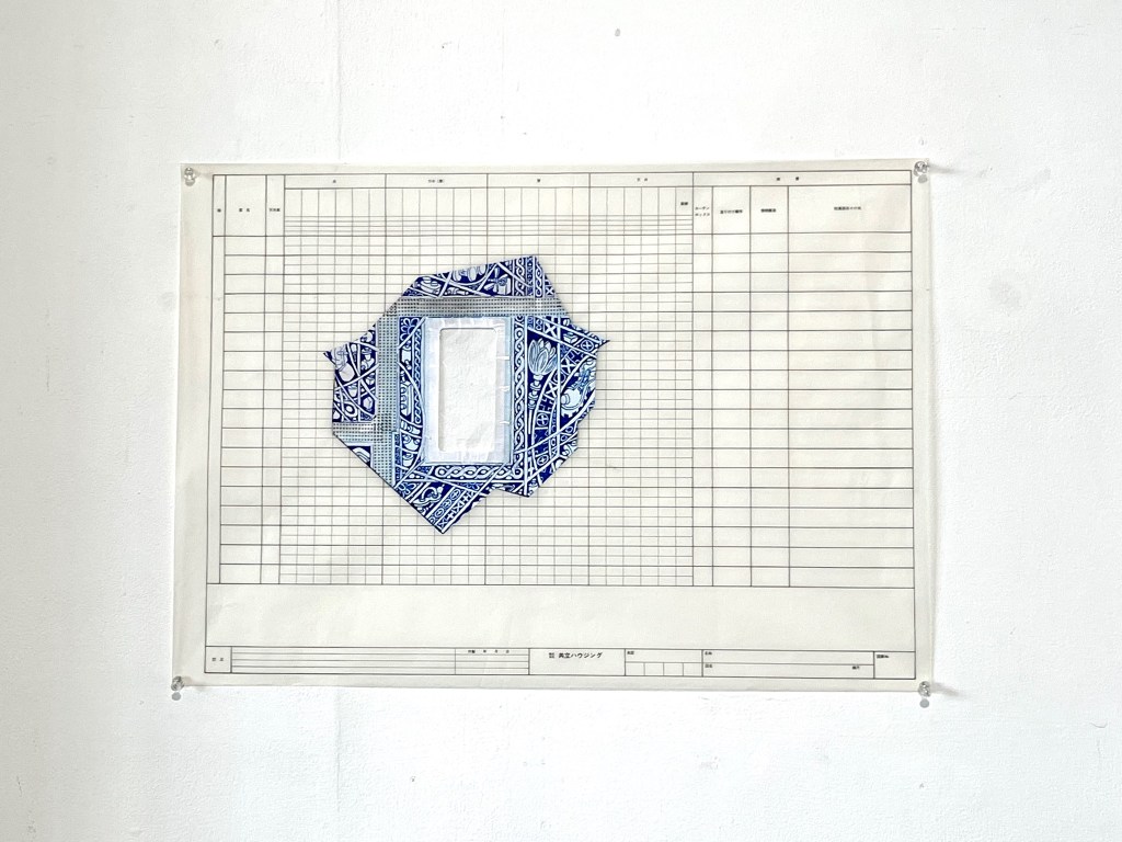 The first large-scale drawing set up was Ono-Moiré – a constructed ground of over twenty re-used windowed envelopes, taped together, attempting to mirror or mimic the unique topographic tessellation of Onomichi’s hillside communities’ architecture. In Ono-Moiré, I used externally facing taped construction for the first time, combining that with initial grids developed from generic house outlines and overlayed onto concentric circular patterns, which relate to the mapping of repeated routine-based journeys around the area. The spaces formed through the combination of physical constructed elements and applied frameworks were then populated with drawings. The drawings were hybrid constructs and responses to the object and pattern-based materiality I encountered while in Onomichi. The newly formed objects are combinations of things and patterns – direct responses to objects, observed and imagined individually or collectively. The objects evolved and developed in response to the compartmentalised spaces formed by the grids, which simultaneously confined, tailored, and authored them. The final part of this process was to remove a section, using a template of a generic house to cut a negative space that purposefully disregarded and crossed over and interrupted the tape and grid-based language boundaries. The negative shape formed a new window akin to the embedded windows of the initial fabricated envelope ground. Instead of the traditional cellophane window cover, the new window was covered or glazed with ledger-like semi-transparent document paper. A document format used by the local authority and housing companies to catalogue, collate and archive the condition and contents of the vacant or abandoned houses before future or re-use. This was a direct commentary on the reality that many of these hillside properties remain vacant.