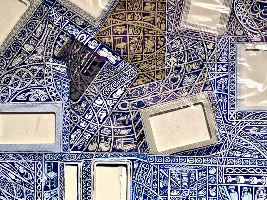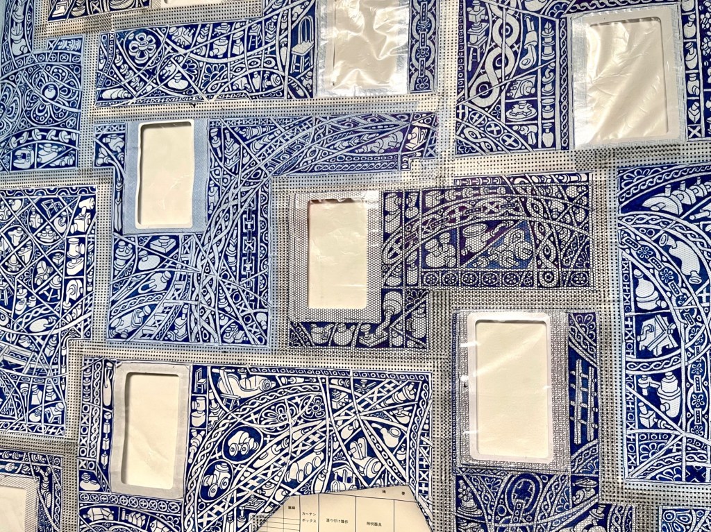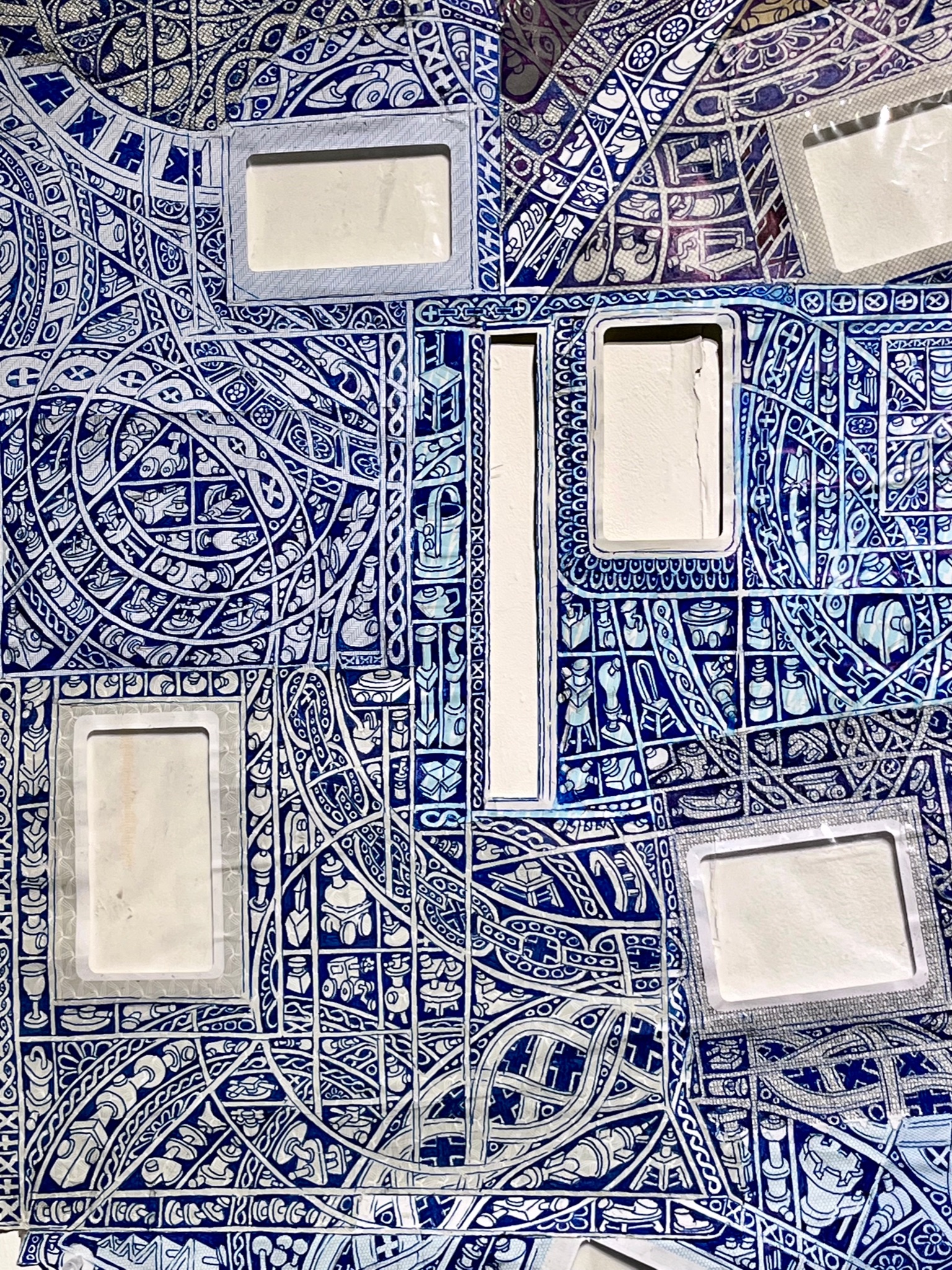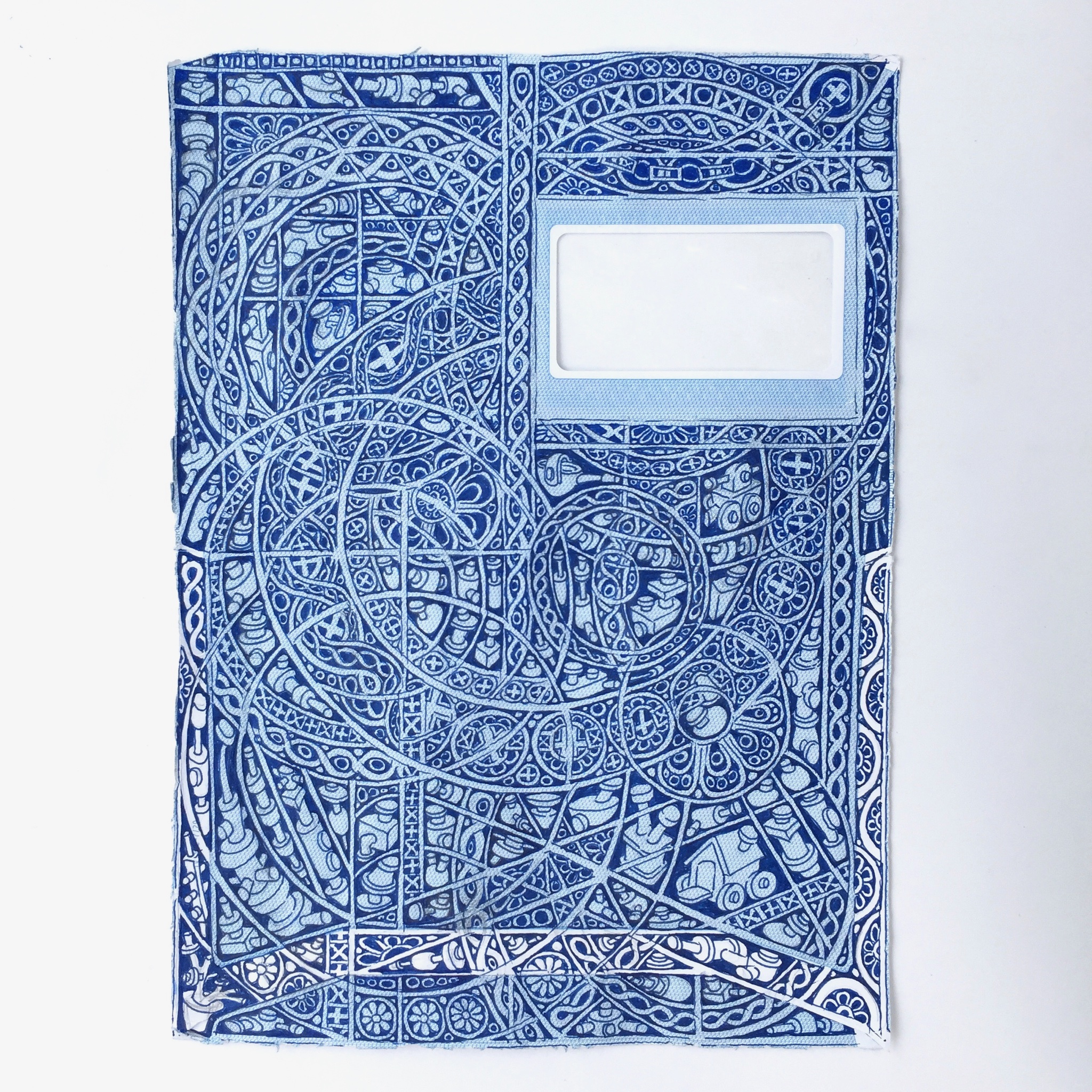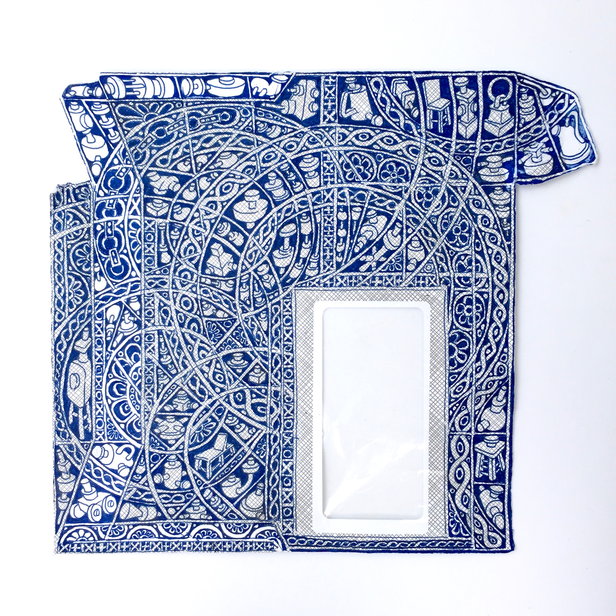 The first large-scale drawing set up was Ono-Moiré – a constructed ground of over twenty re-used windowed envelopes, taped together, attempting to mirror or mimic the unique topographic tessellation of Onomichi’s hillside communities’ architecture. In Ono-Moiré, I used externally facing taped construction for the first time, combining that with initial grids developed from generic house outlines and overlayed onto concentric circular patterns, which relate to the mapping of repeated routine-based journeys around the area. The spaces formed through the combination of physical constructed elements and applied frameworks were then populated with drawings. The drawings were hybrid constructs and responses to the object and pattern-based materiality I encountered while in Onomichi. The newly formed objects are combinations of things and patterns – direct responses to objects, observed and imagined individually or collectively. The objects evolved and developed in response to the compartmentalised spaces formed by the grids, which simultaneously confined, tailored, and authored them. The final part of this process was to remove a section, using a template of a generic house to cut a negative space that purposefully disregarded and crossed over and interrupted the tape and grid-based language boundaries. The negative shape formed a new window akin to the embedded windows of the initial fabricated envelope ground. Instead of the traditional cellophane window cover, the new window was covered or glazed with ledger-like semi-transparent document paper. A document format used by the local authority and housing companies to catalogue, collate and archive the condition and contents of the vacant or abandoned houses before future or re-use. This was a direct commentary on the reality that many of these hillside properties remain vacant.