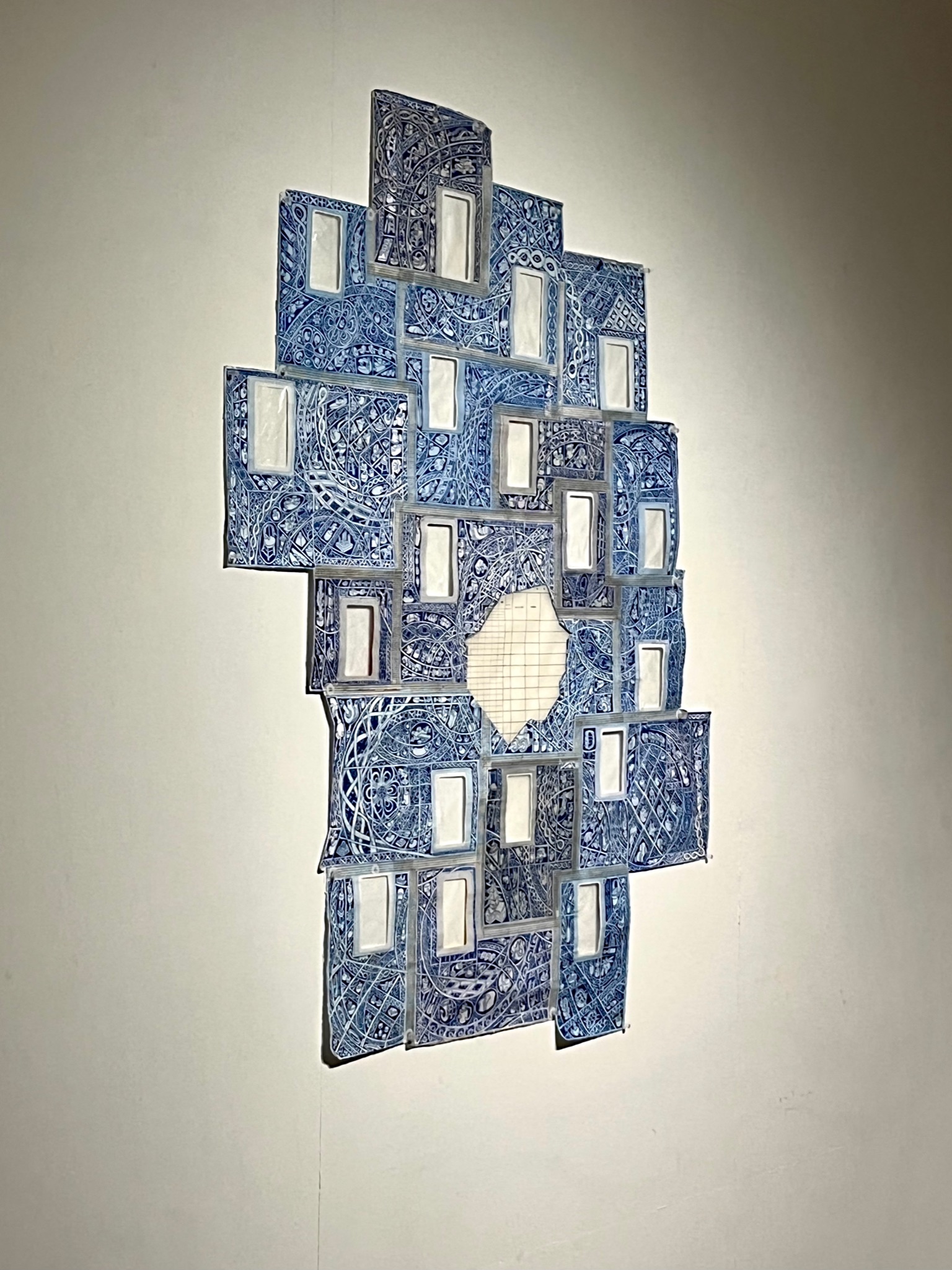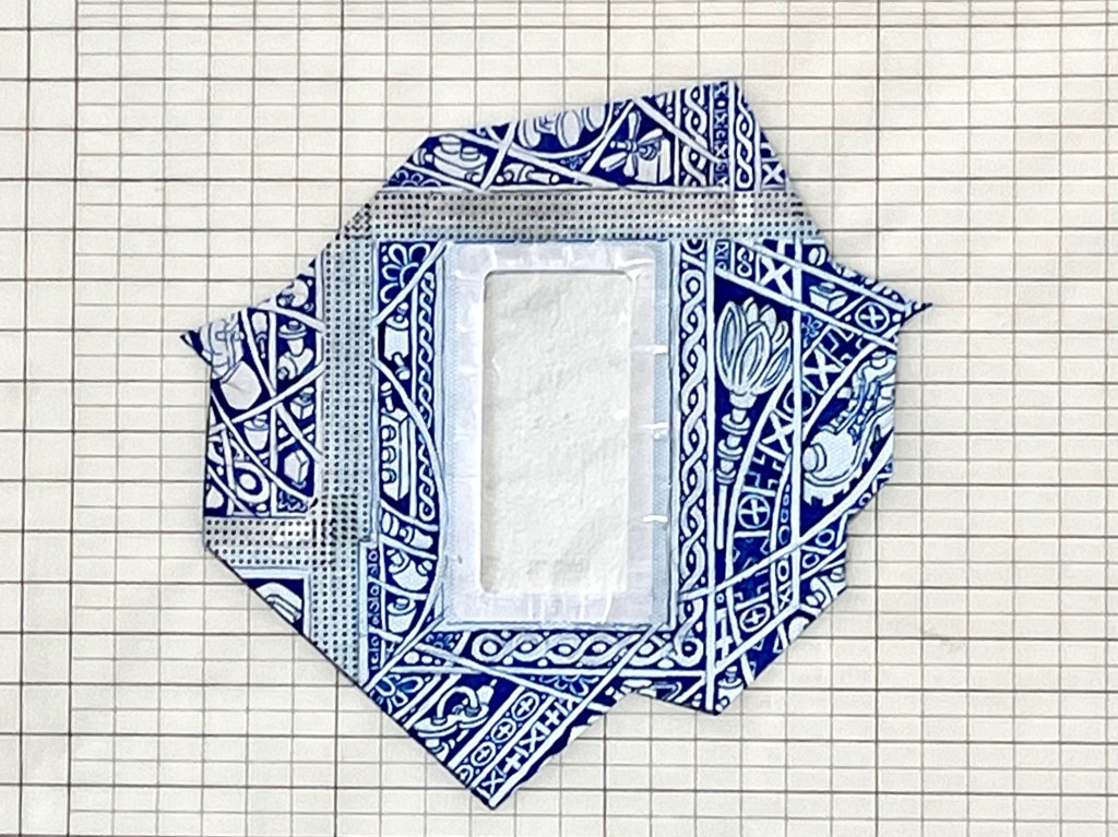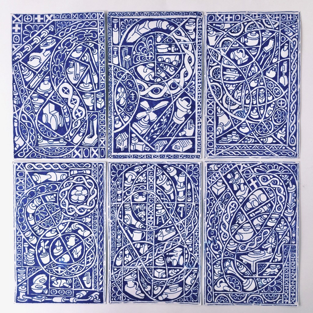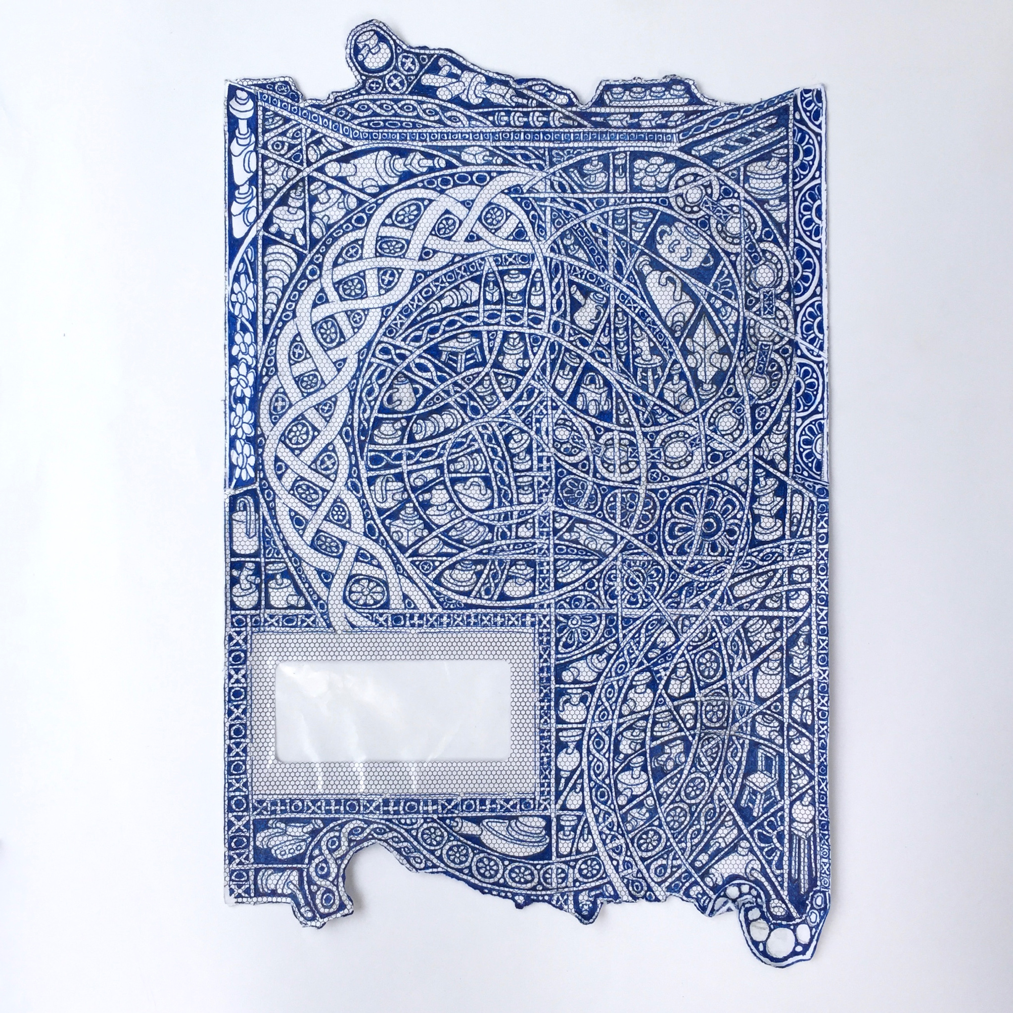 The first large-scale drawing set up was Ono-Moiré – a constructed ground of over twenty re-used windowed envelopes, taped together, attempting to mirror or mimic the unique topographic tessellation of Onomichi’s hillside communities’ architecture. In Ono-Moiré, I used externally facing taped construction for the first time, combining that with initial grids developed from generic house outlines and overlayed onto concentric circular patterns, which relate to the mapping of repeated routine-based journeys around the area. The spaces formed through the combination of physical constructed elements and applied frameworks were then populated with drawings. The drawings were hybrid constructs and responses to the object and pattern-based materiality I encountered while in Onomichi. The newly formed objects are combinations of things and patterns – direct responses to objects, observed and imagined individually or collectively. The objects evolved and developed in response to the compartmentalised spaces formed by the grids, which simultaneously confined, tailored, and authored them. The final part of this process was to remove a section, using a template of a generic house to cut a negative space that purposefully disregarded and crossed over and interrupted the tape and grid-based language boundaries. The negative shape formed a new window akin to the embedded windows of the initial fabricated envelope ground. Instead of the traditional cellophane window cover, the new window was covered or glazed with ledger-like semi-transparent document paper. A document format used by the local authority and housing companies to catalogue, collate and archive the condition and contents of the vacant or abandoned houses before future or re-use. This was a direct commentary on the reality that many of these hillside properties remain vacant.