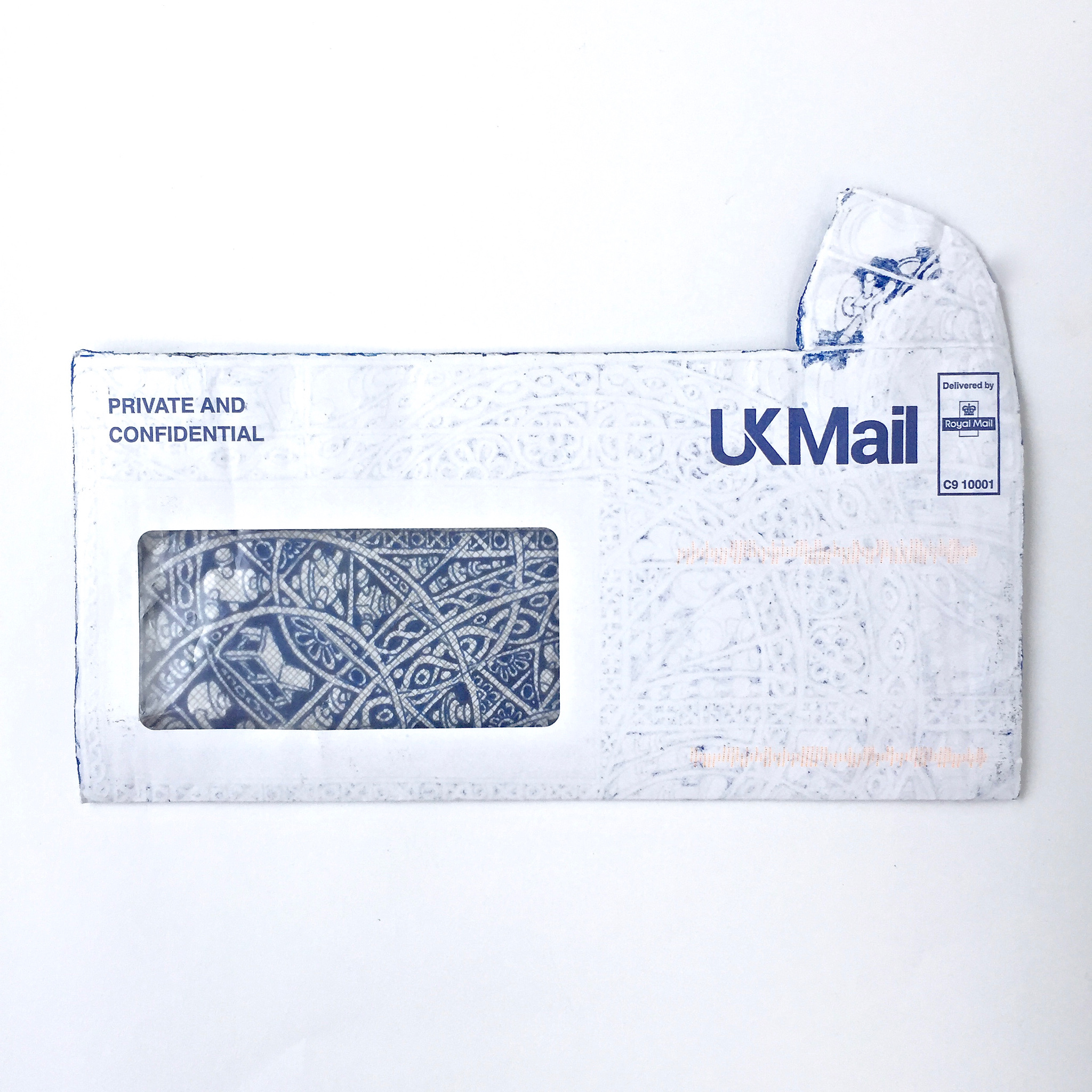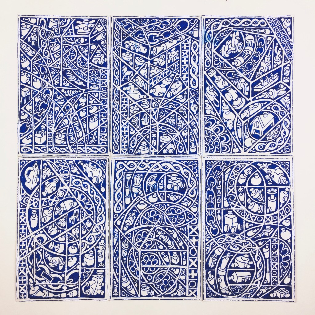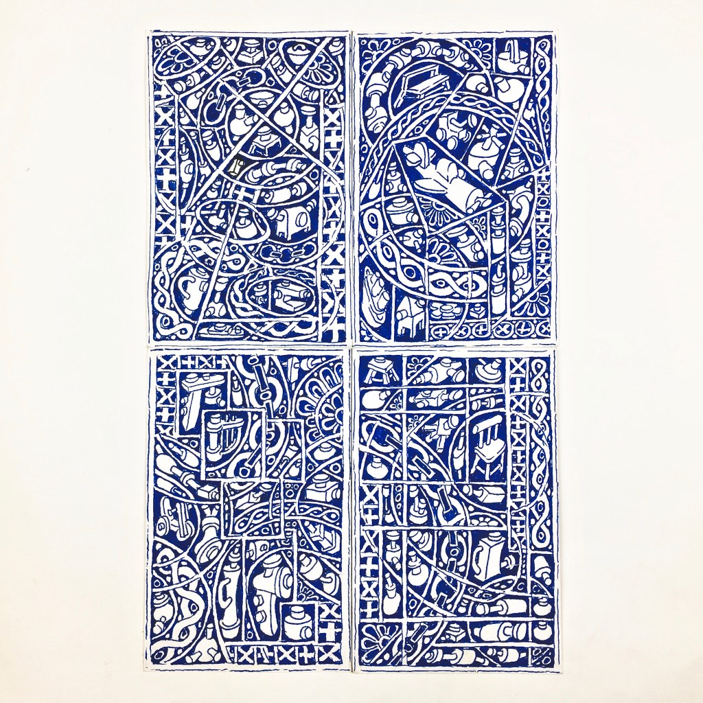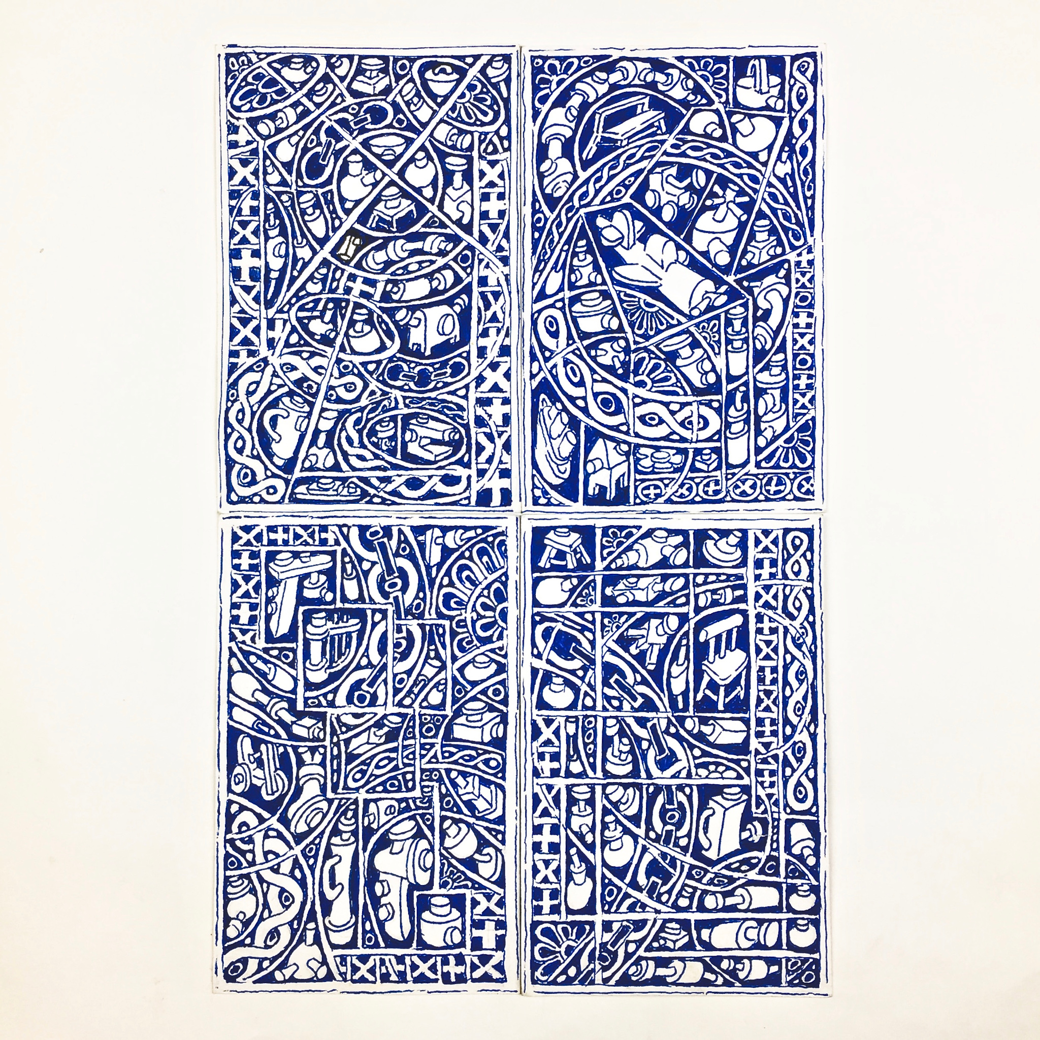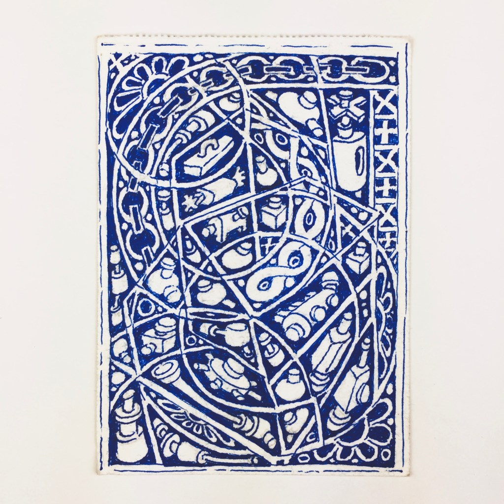 The first large-scale drawing set up was Ono-Moiré – a constructed ground of over twenty re-used windowed envelopes, taped together, attempting to mirror or mimic the unique topographic tessellation of Onomichi’s hillside communities’ architecture. In Ono-Moiré, I used externally facing taped construction for the first time, combining that with initial grids developed from generic house outlines and overlayed onto concentric circular patterns, which relate to the mapping of repeated routine-based journeys around the area. The spaces formed through the combination of physical constructed elements and applied frameworks were then populated with drawings. The drawings were hybrid constructs and responses to the object and pattern-based materiality I encountered while in Onomichi. The newly formed objects are combinations of things and patterns – direct responses to objects, observed and imagined individually or collectively. The objects evolved and developed in response to the compartmentalised spaces formed by the grids, which simultaneously confined, tailored, and authored them. The final part of this process was to remove a section, using a template of a generic house to cut a negative space that purposefully disregarded and crossed over and interrupted the tape and grid-based language boundaries. The negative shape formed a new window akin to the embedded windows of the initial fabricated envelope ground. Instead of the traditional cellophane window cover, the new window was covered or glazed with ledger-like semi-transparent document paper. A document format used by the local authority and housing companies to catalogue, collate and archive the condition and contents of the vacant or abandoned houses before future or re-use. This was a direct commentary on the reality that many of these hillside properties remain vacant.