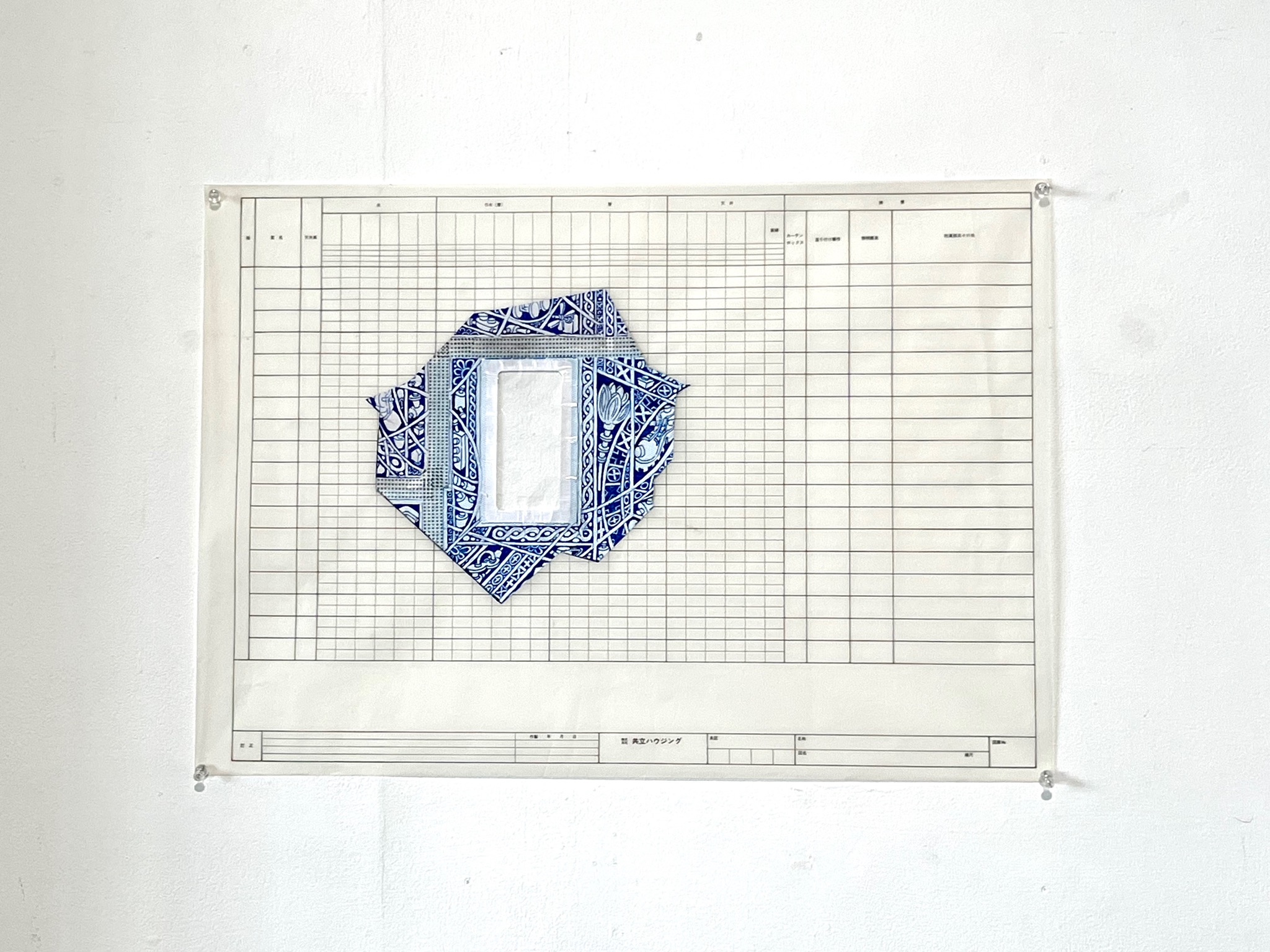 The last two works produced and exhibited in Ichi-Ni-San-Shi-Dōzo were by-products or residues of the two main works, Morié-Iè and Ono-Moirè. The first was Ledger, a collage on found document paper, using the cut-out house silhouette with a centralised widow taken from Ono-Moirè. The cut-out was placed on a semi-transparent ledger document paper used by the local authority and housing companies to catalogue, collect and archive the condition and contents of the house before future use. The house silhouette was placed within the housing contents inventory form rubric, which would list individual contents or wear and tear. This composition directly comments on the reality of these communities and that many properties remain vacant.