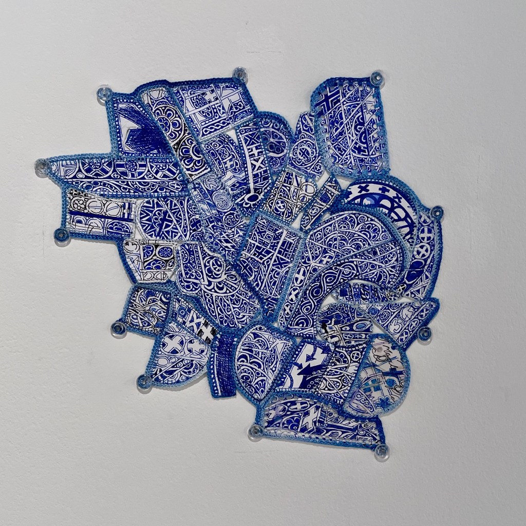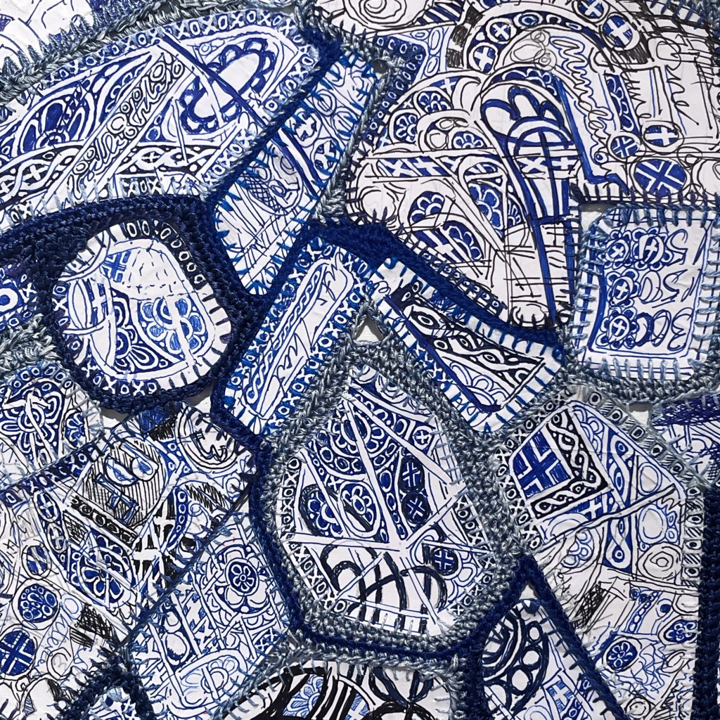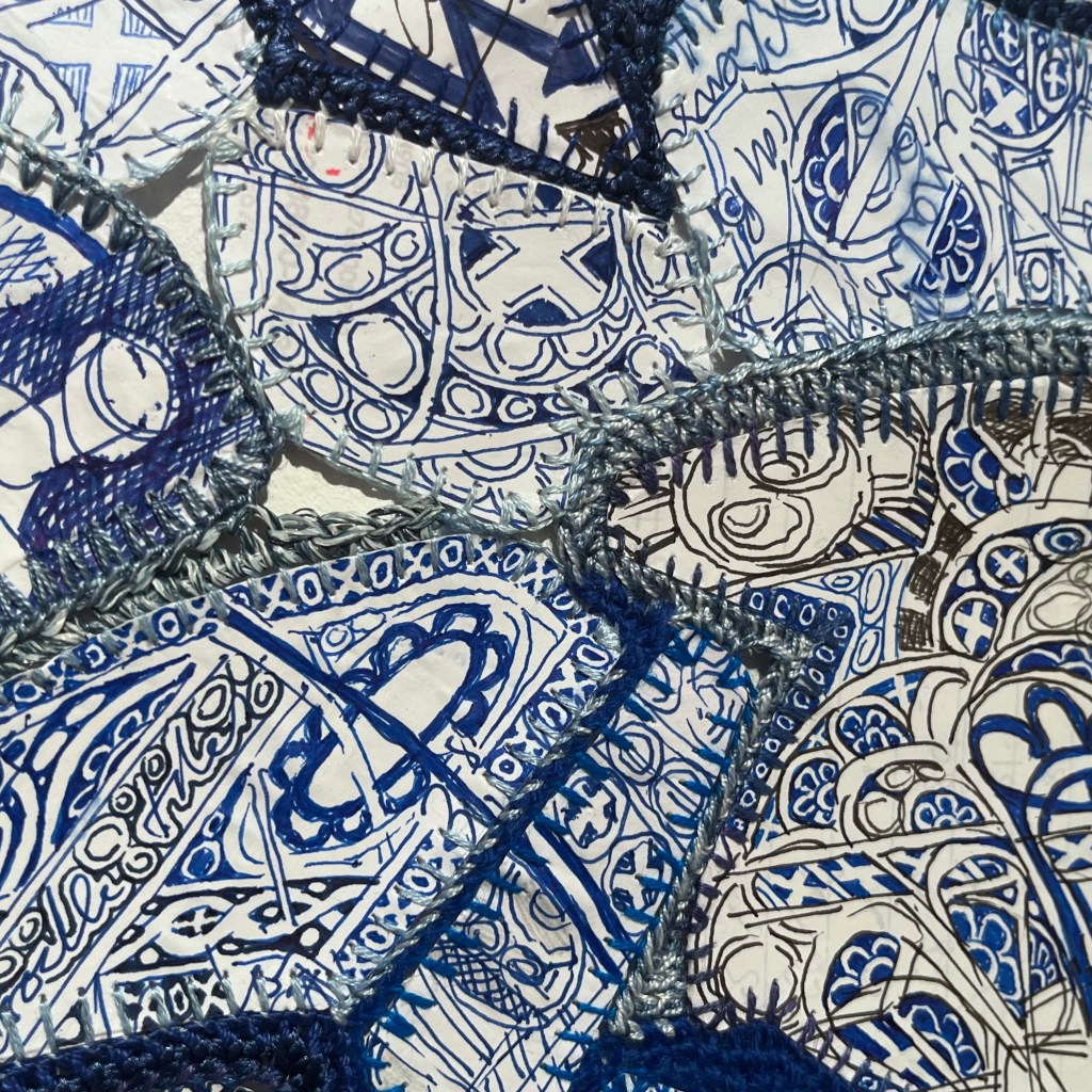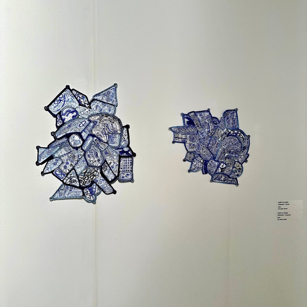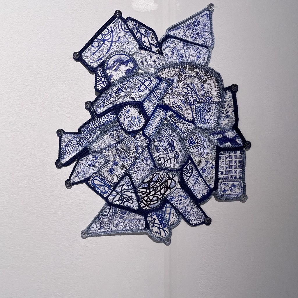 Reiteration – Pitcher and Reiteration – Ornament are part of a series of works that reconstitute fragments of drawings created during lockdown periods. These drawings, which emerged from the unique experience of engaging with the world through a screen, are pieced together to form silhouettes. These silhouettes resemble objects, devices, or characters which are familiar and unfamiliar. They are brought to life through stitching and crochet, using threads that echo the original pen drawings. The patchworks operate similarly to the processes like Kintsugi; the notion of the repair represents the transient nature of the lockdown period, where we were all trying to mend and repair without a clear memory of the original form and function.